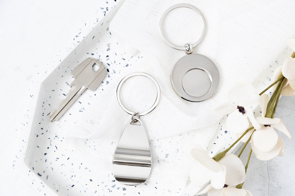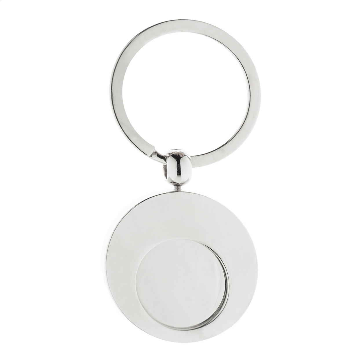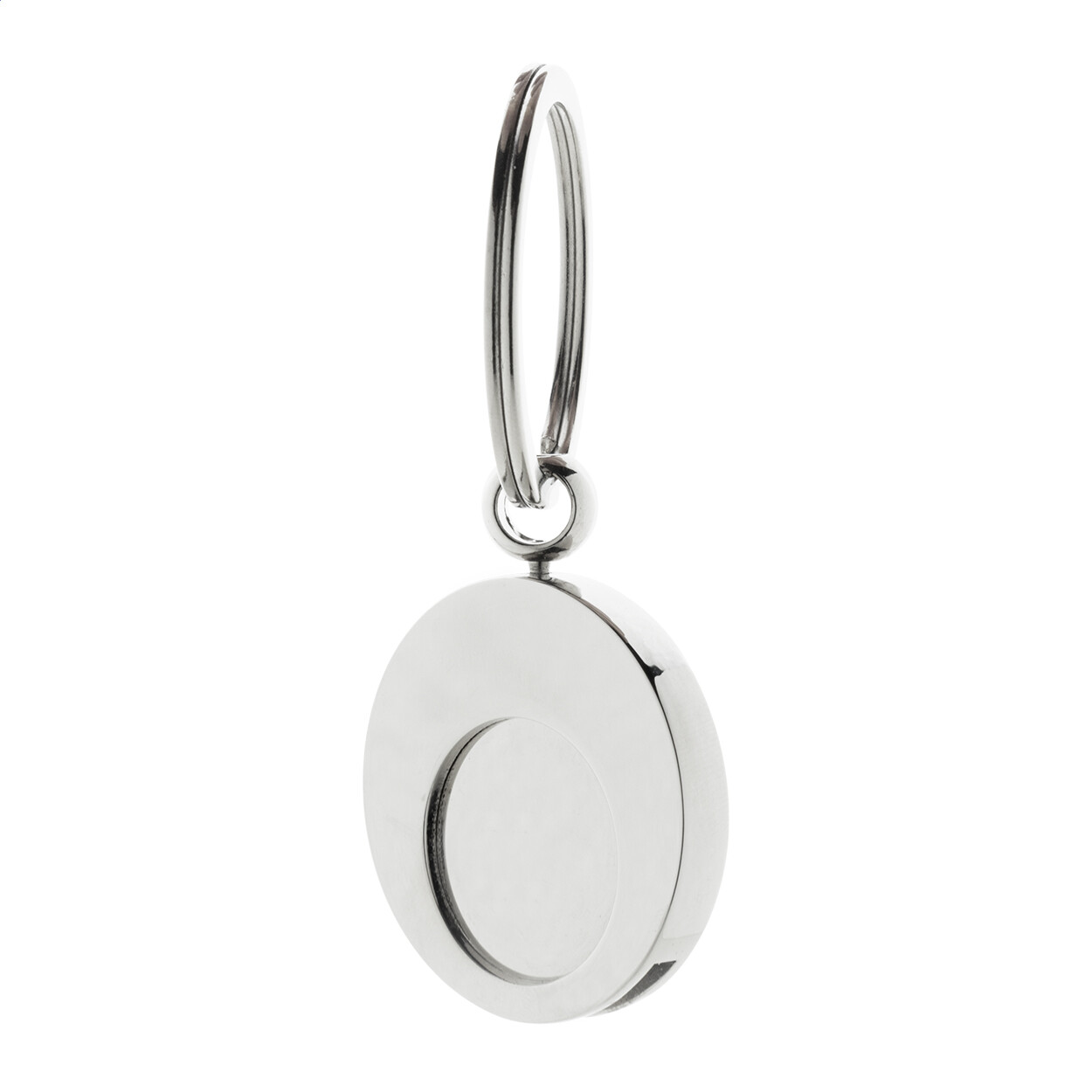 Porte-clés en métal de forme ronde avec jeton pour chariot de courses. Livré dans une boîte en papier kraft.