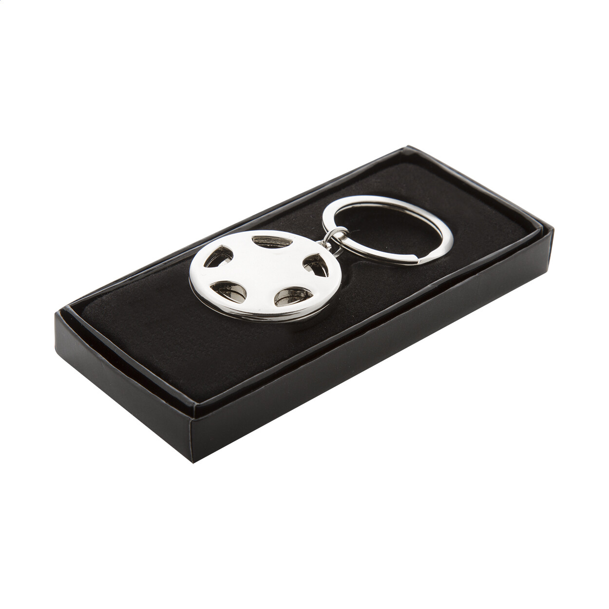 Porte-clés jeton en métal en forme de roue de voiture. Livré dans une boîte cadeau noire.