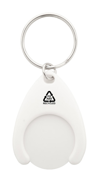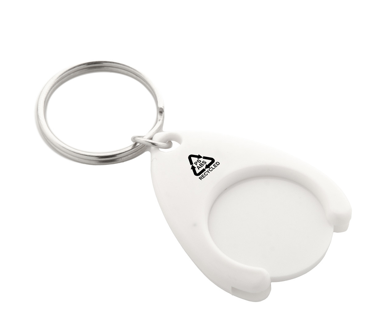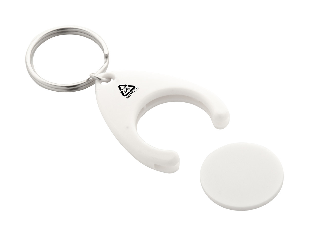 Porte-clés en plastique ABS recyclé avec jeton pour charriot et anneau en métal. Taille de la pièce : ø24×2 mm.