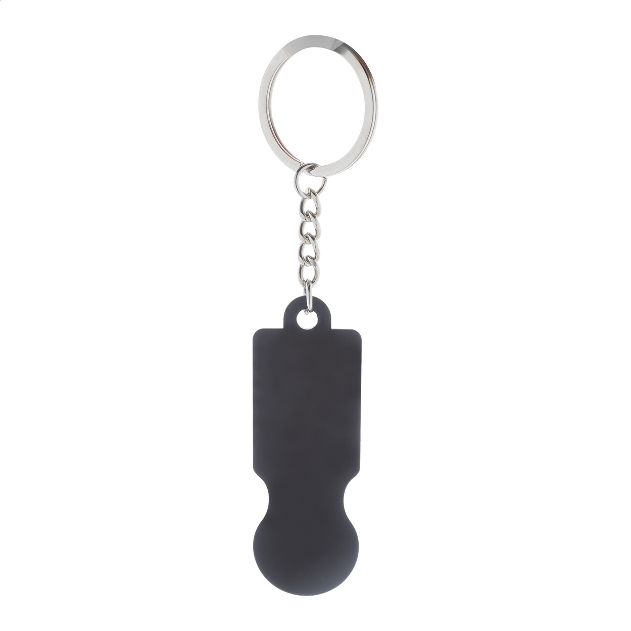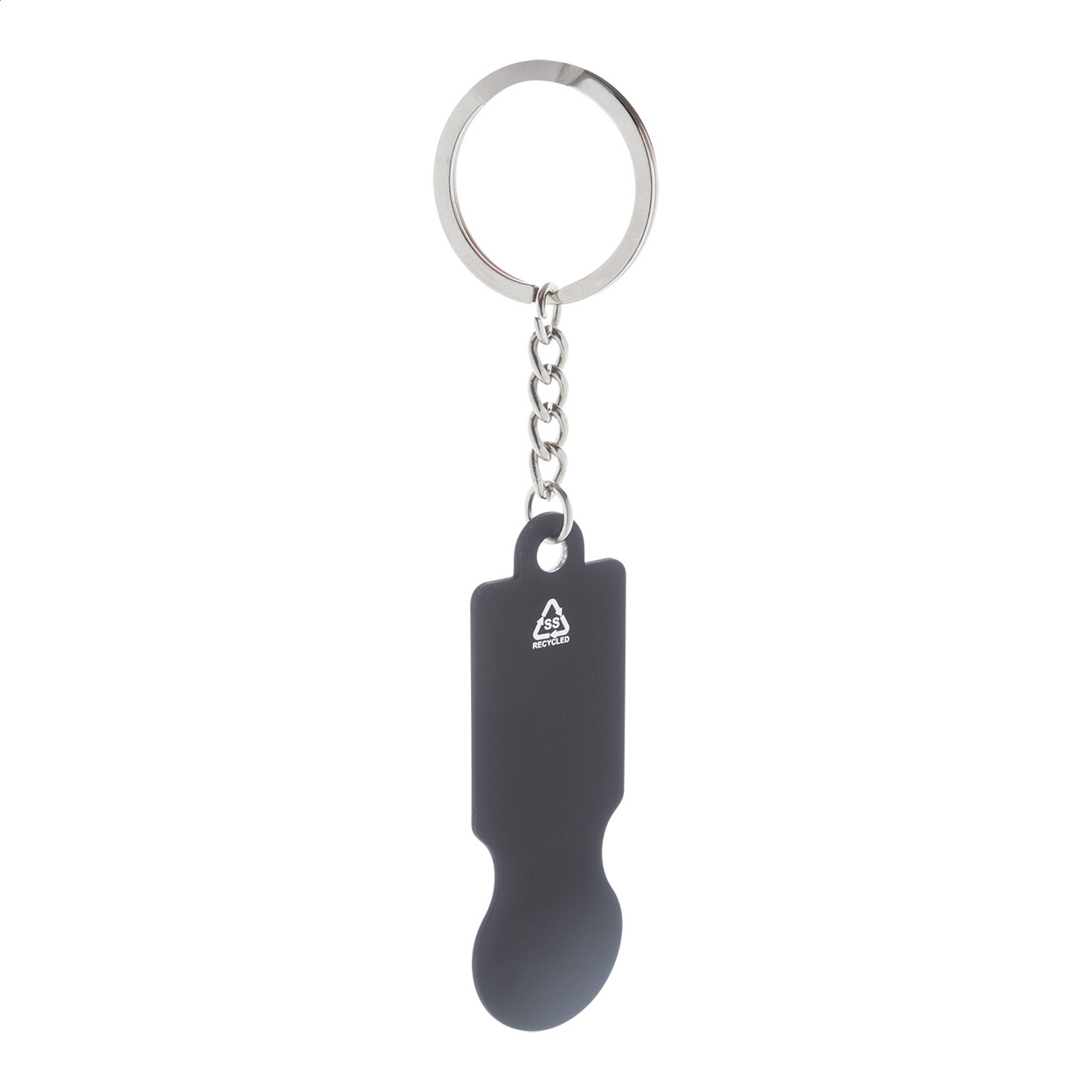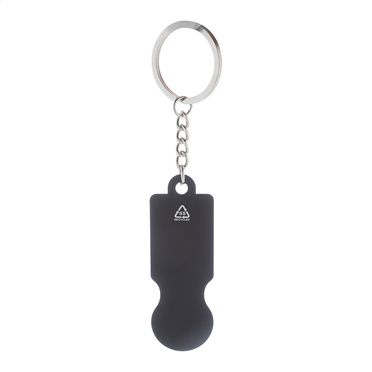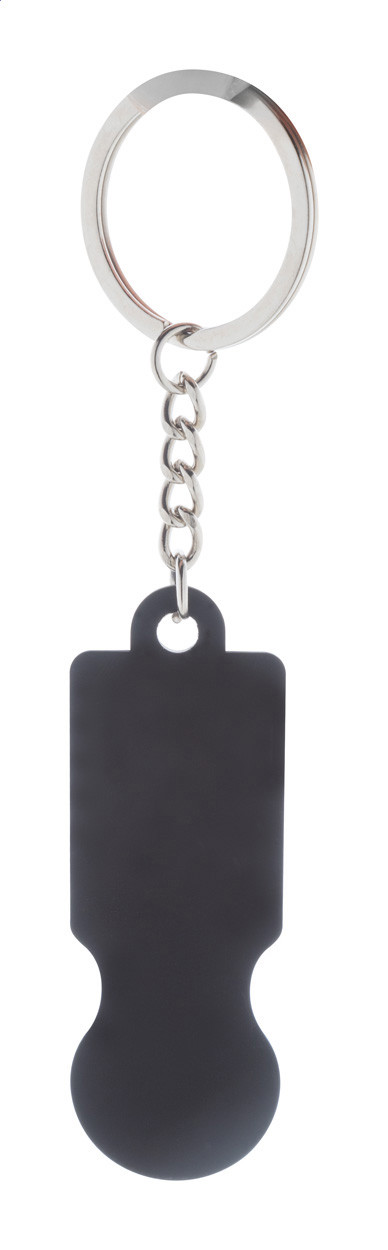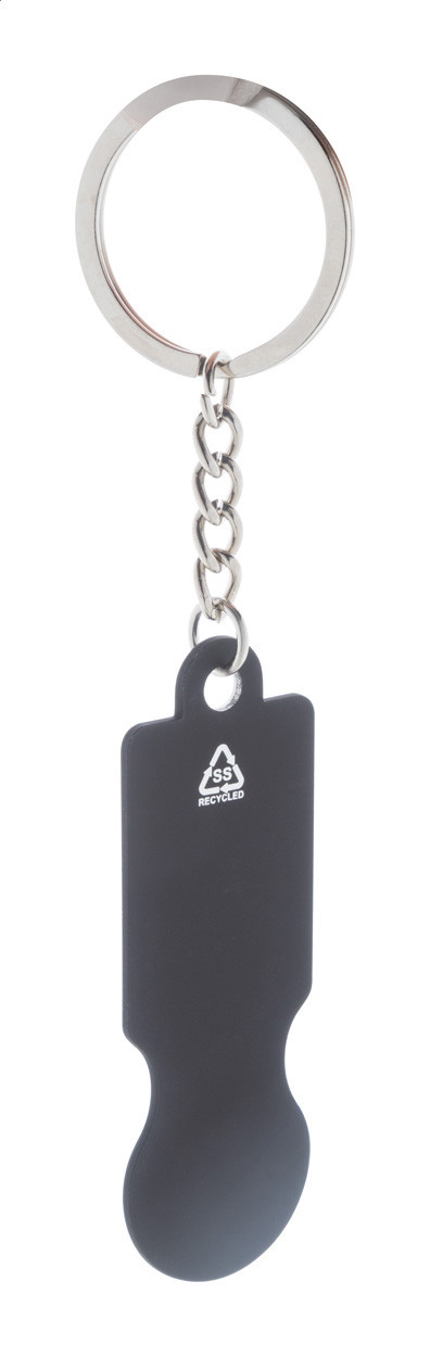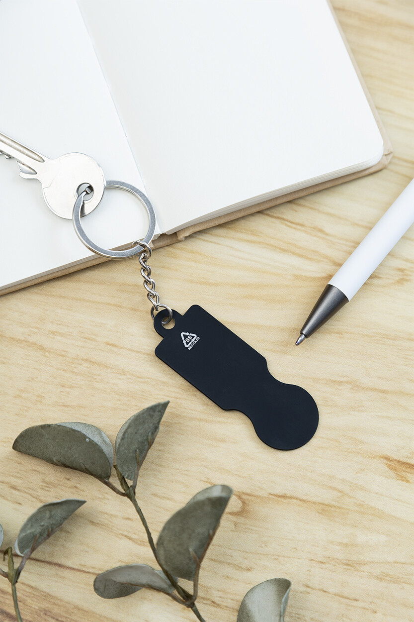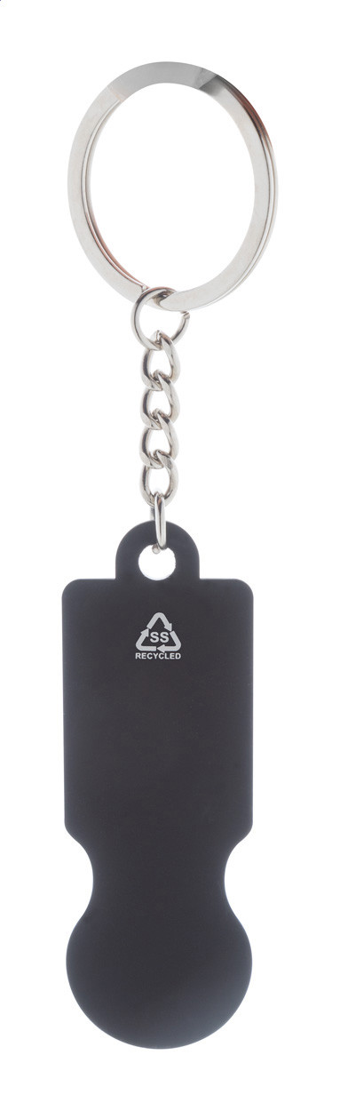 Porte-clés en acier inoxydable recyclé avec finition caoutchoutée et jeton pour chariot de courses. Revêtement spécial pour gravure laser miroir.