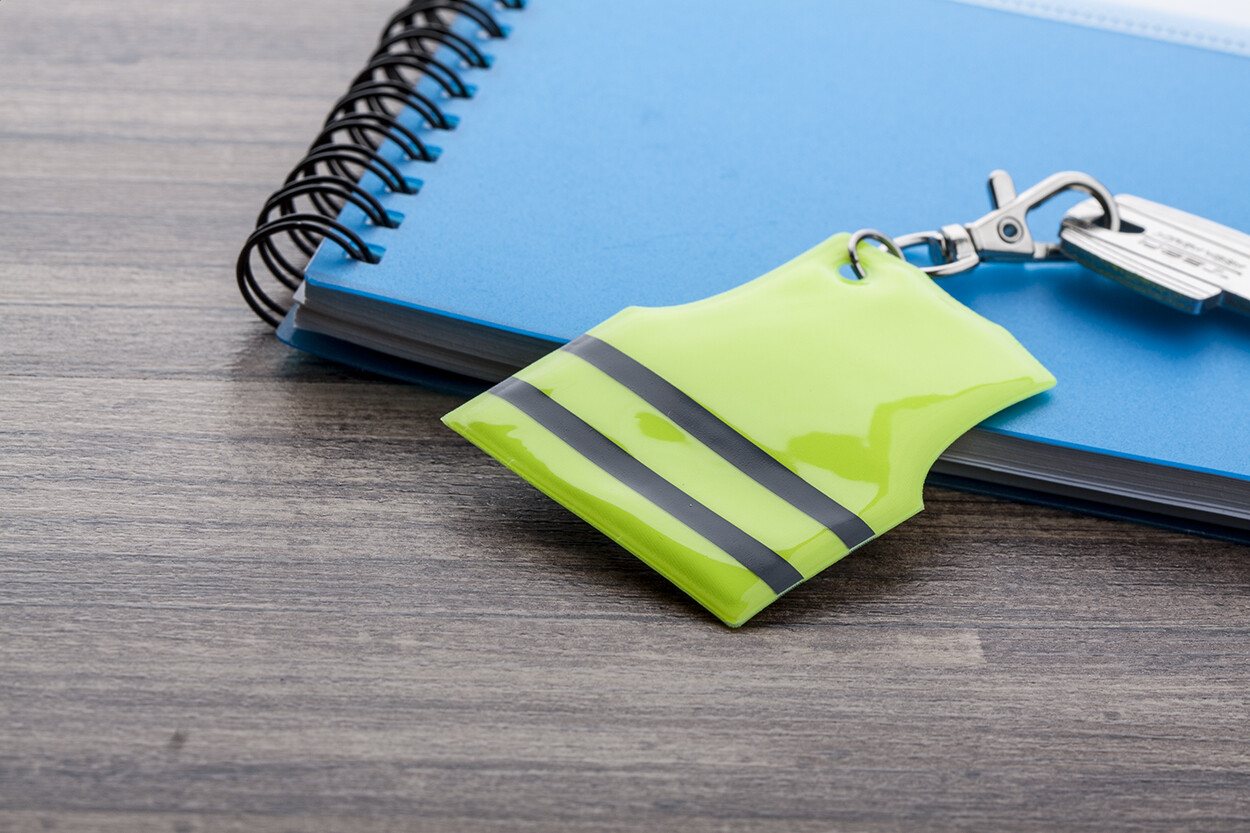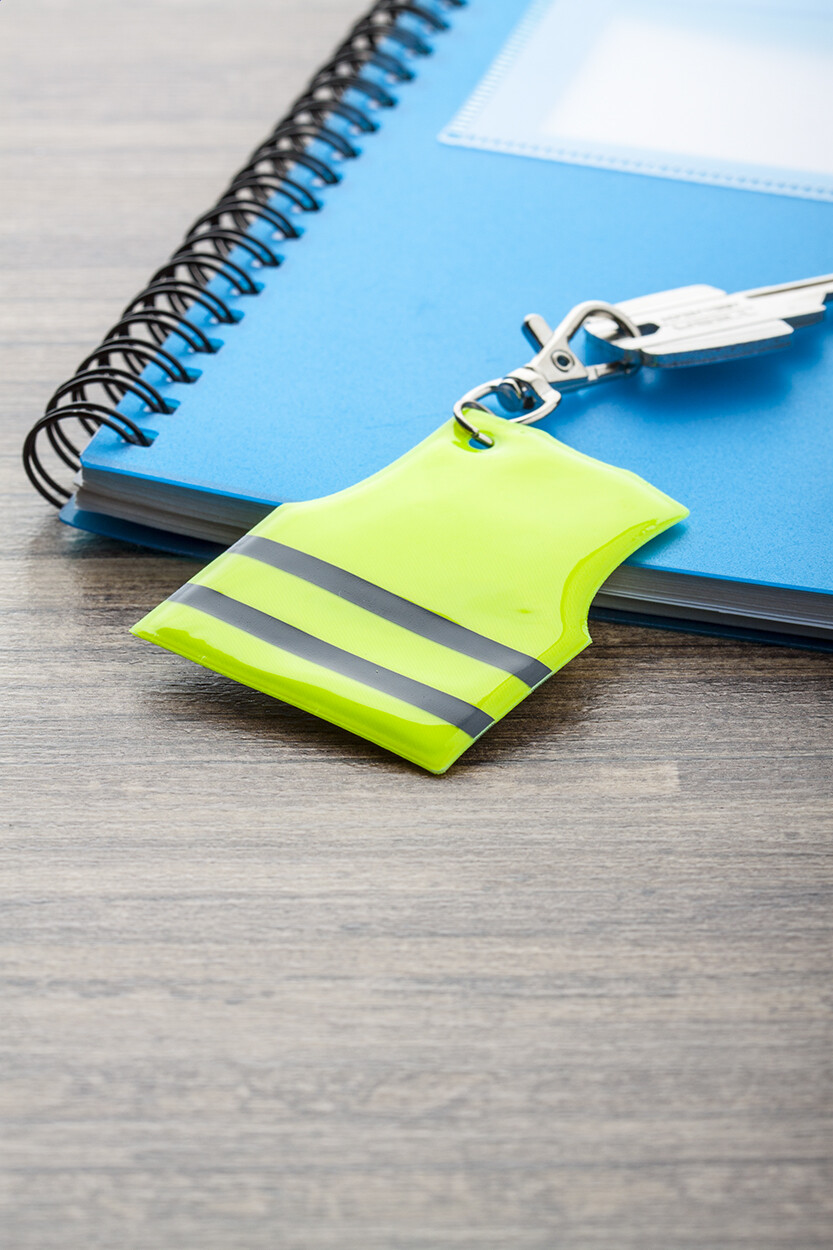 Porte-clés mousqueton avec mini veste réfléchissante. Destiné à un usage promotionnel uniquement, le produit n'est pas considéré comme un équipement de protection individuelle.