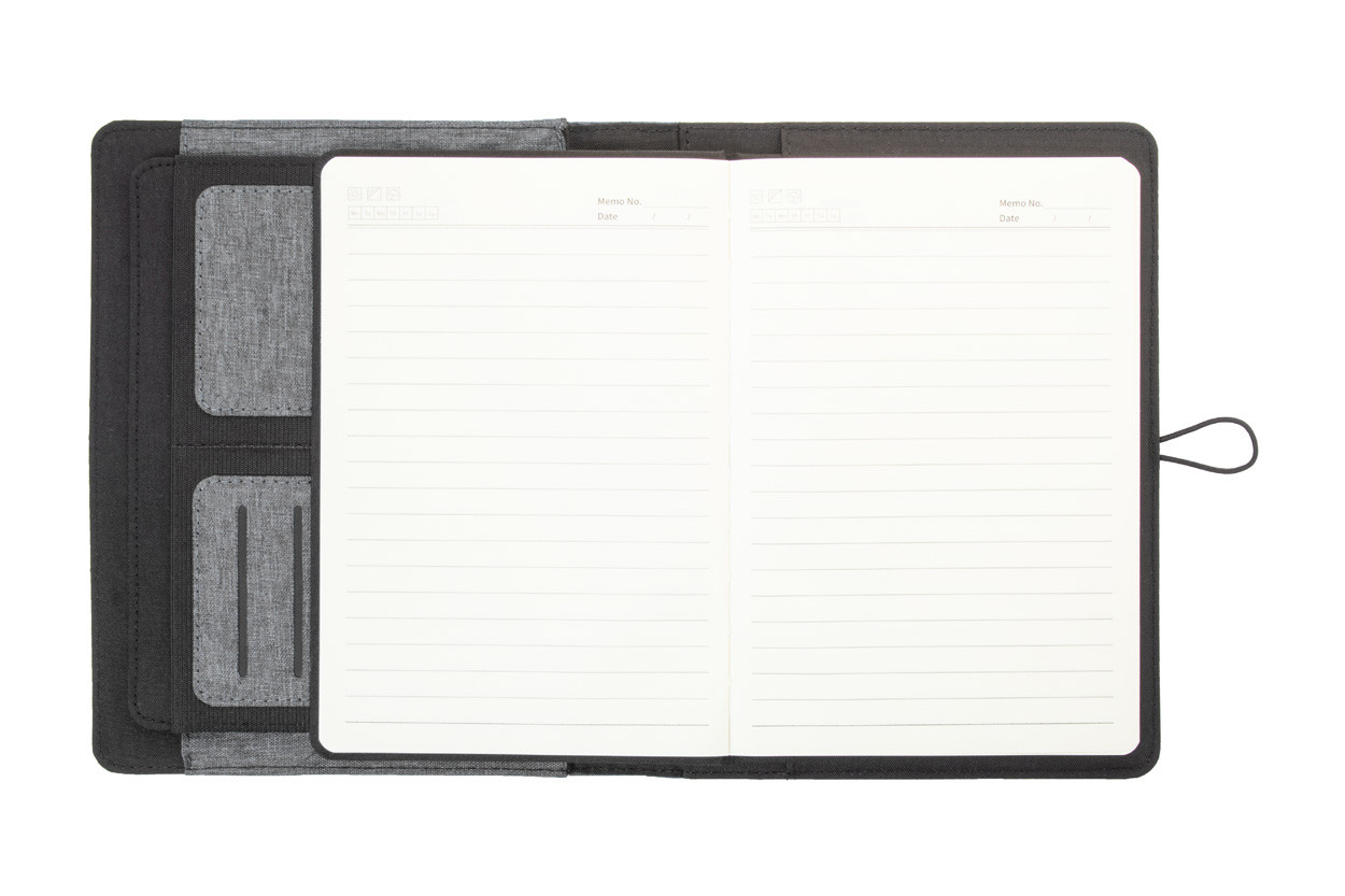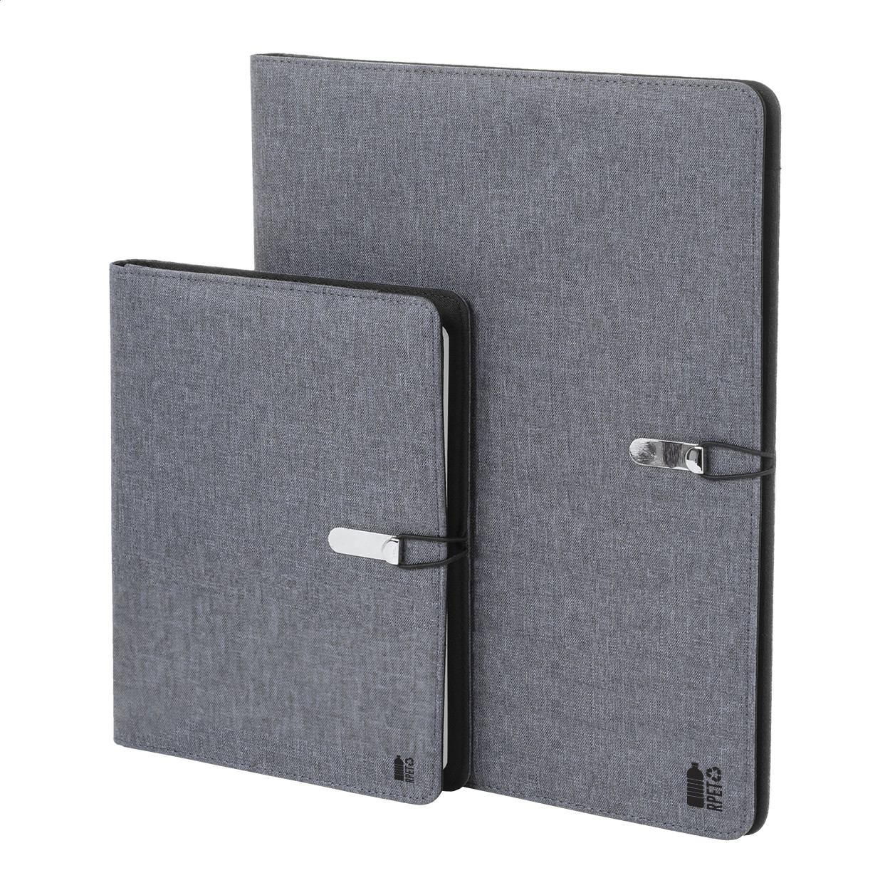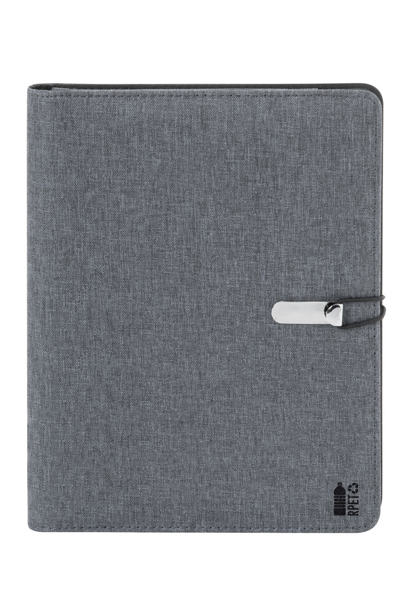 Porte-documents A5 en polyester 300D RPET avec bloc-notes de 64 feuilles lignées et plusieurs poches d'organisation à l'intérieur.