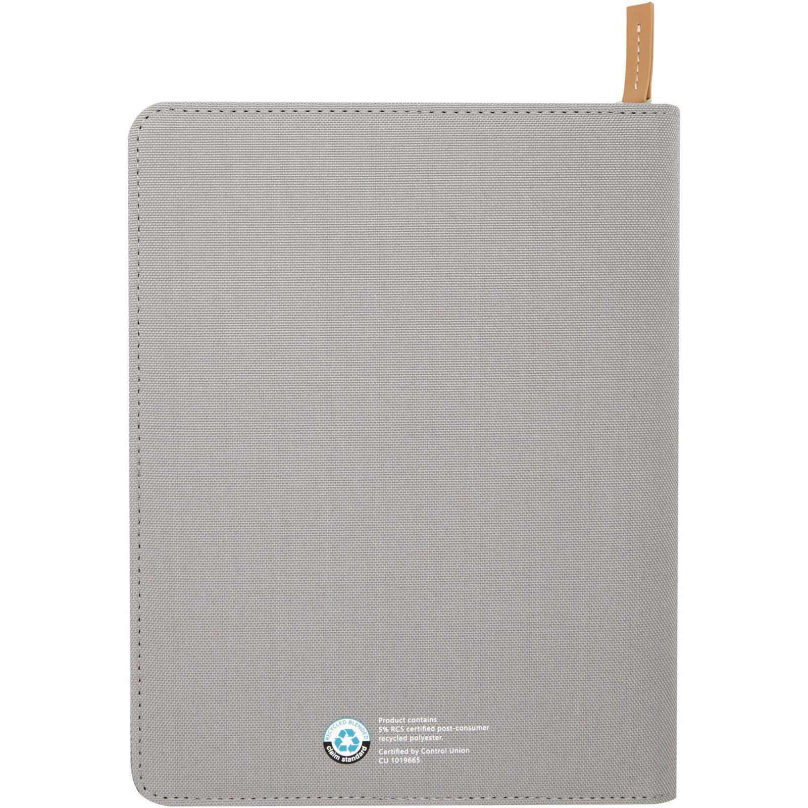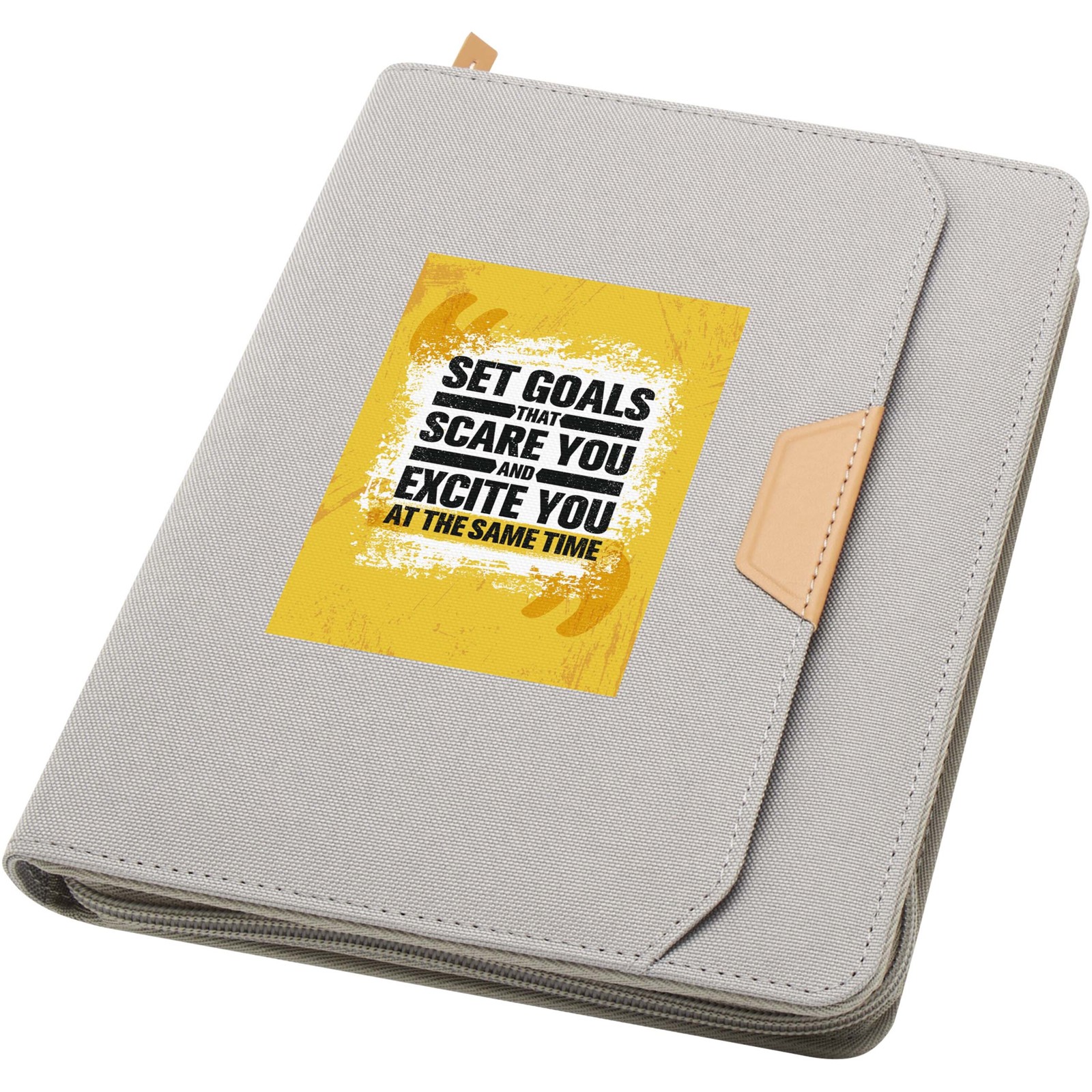 Le porte-document Nomumi A5 avec coins arrondis constitue un accessoire de bureau pratique en plastique recyclé. Comprend 64 feuilles lignées de couleur crème de 80 g/m2, une fermeture à glissière, une boucle pour stylo et une pochette accordéon.