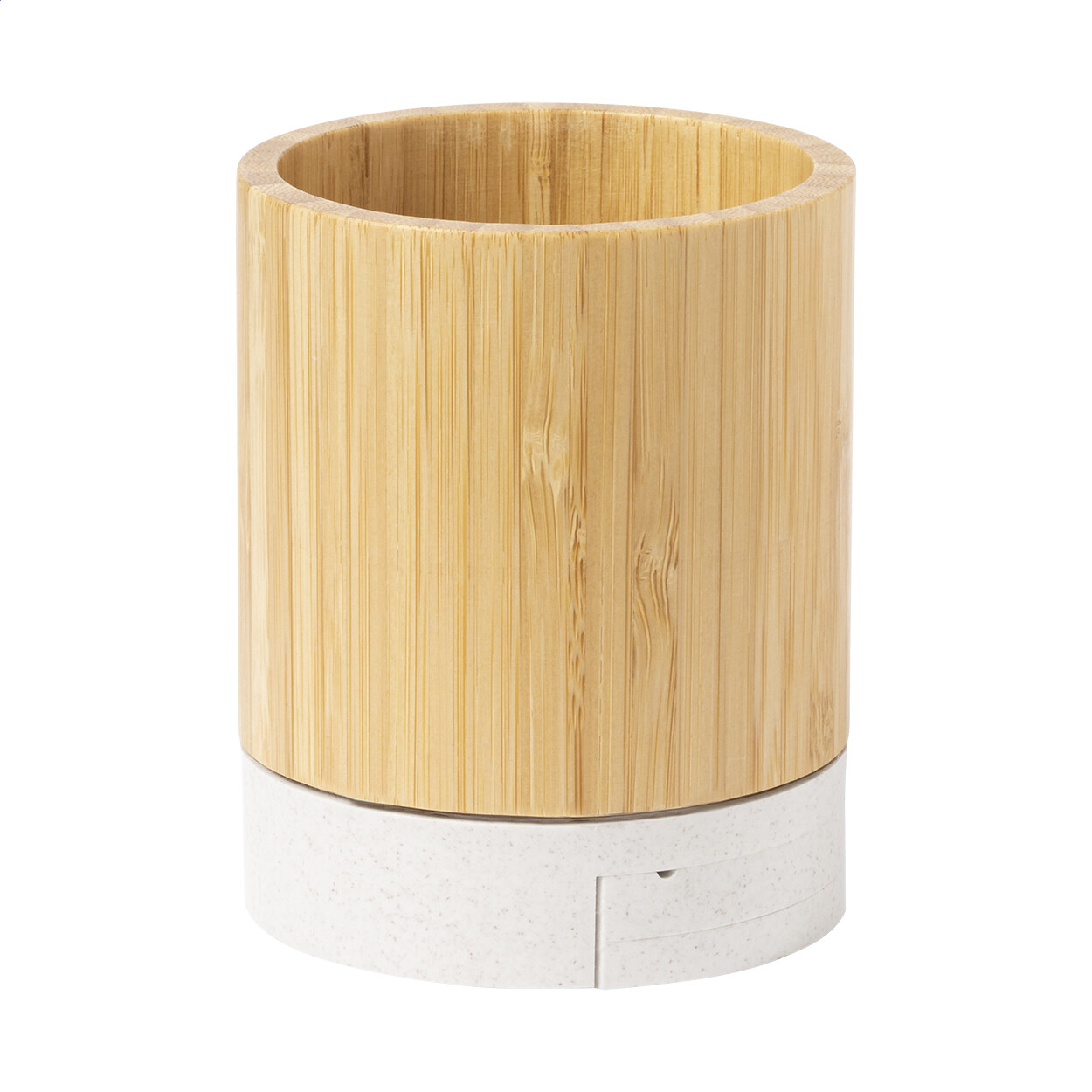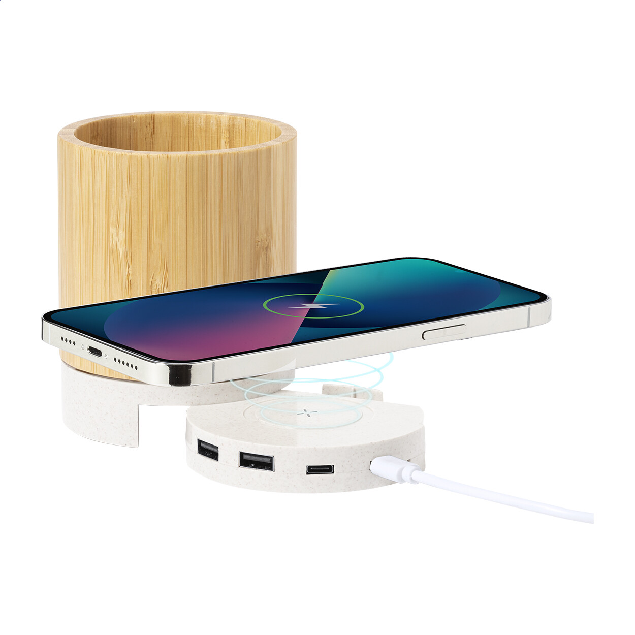 Porte-stylo multifonctionnel en bambou et en plastique écologique en paille de blé. Avec support pour téléphone portable, chargeur sans fil (5W) et port USB à 3 ports (2 ports USB et 1 port USB-C, USB 2.0). Câble de chargement USB inclus.