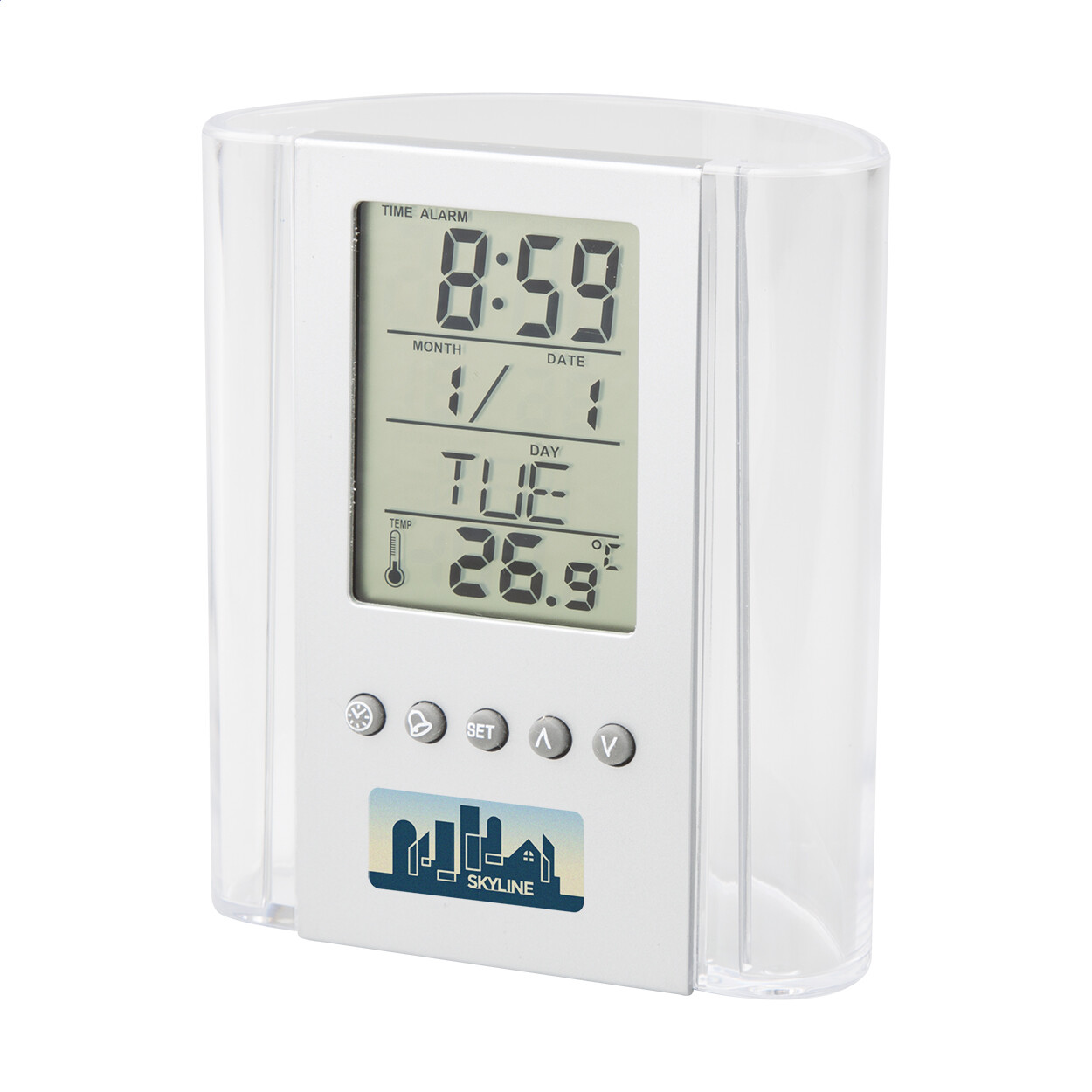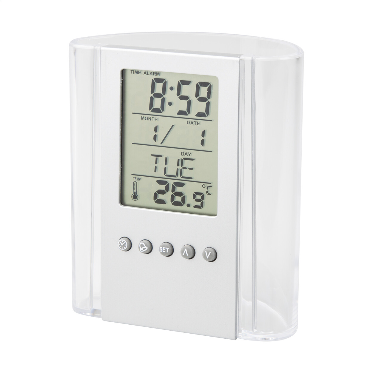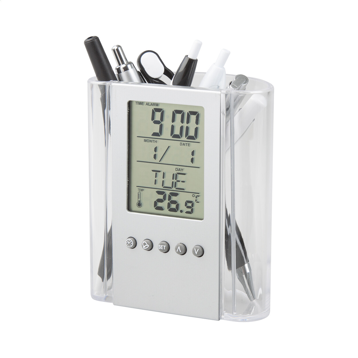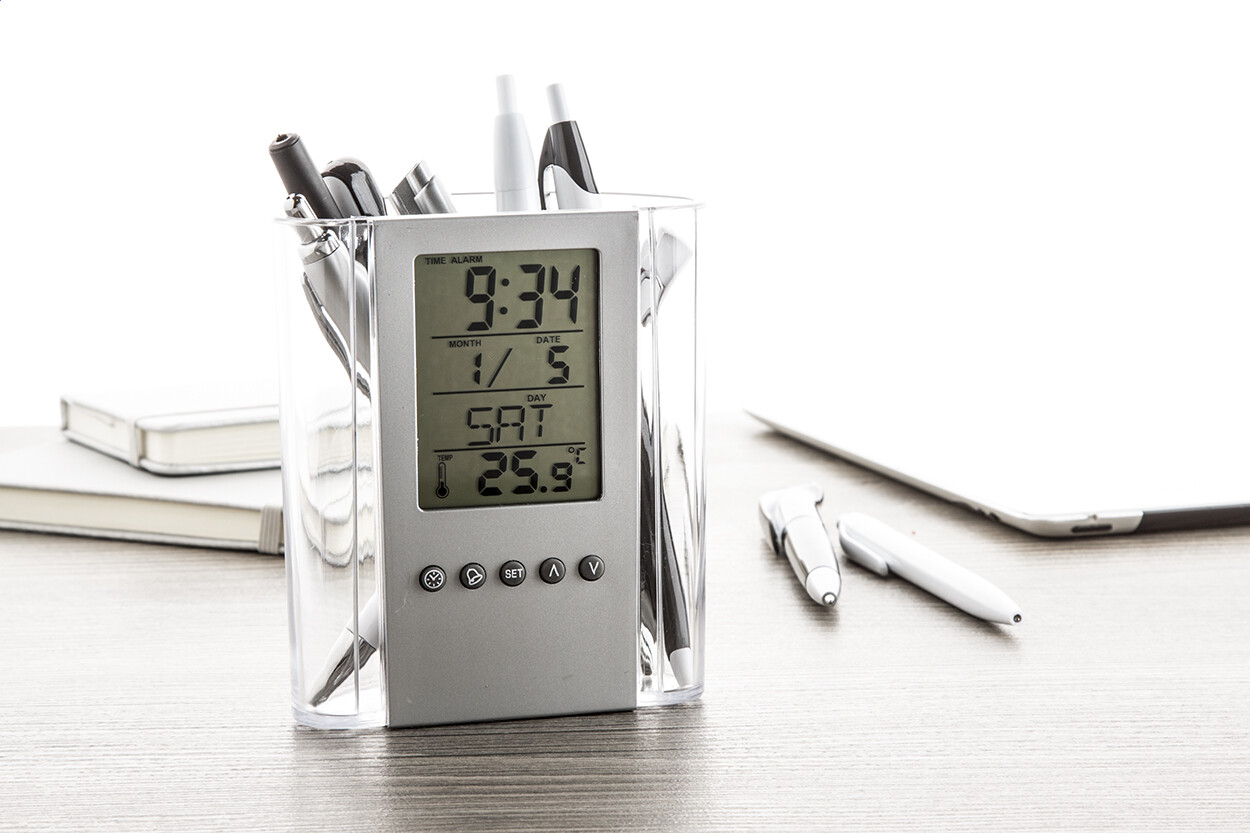 Pot à crayons en plastique transparent avec écran digital et fonctions thermomètre, horloge, alarme et calendrier. Livré avec 1 pile-bouton.