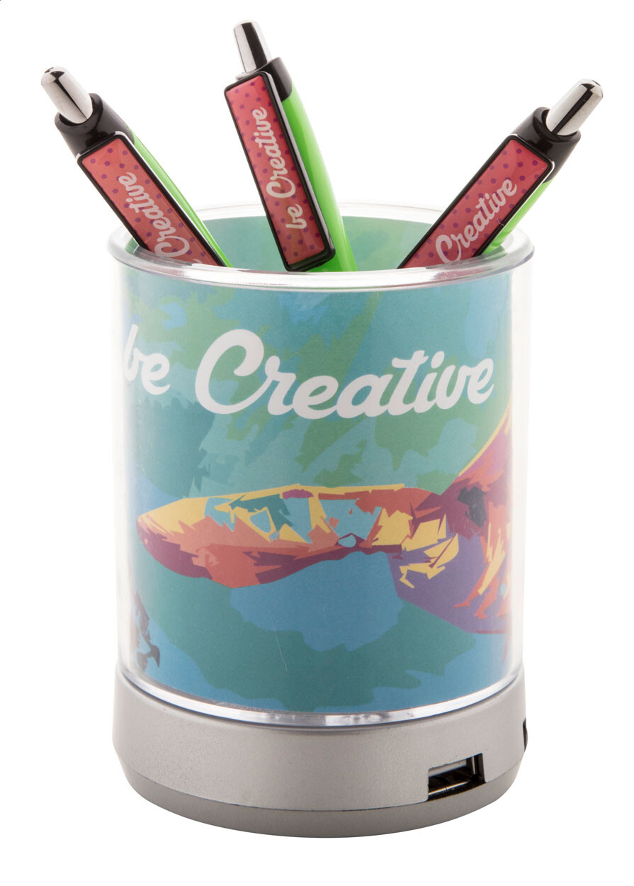 Pot à crayons avec 4-port USB hub et une lampe bleuet. Des images imprimées peuvent être placées entre les doubles parois, ABS. Cet article est livré non monté avec 4 vis dans un polybag.