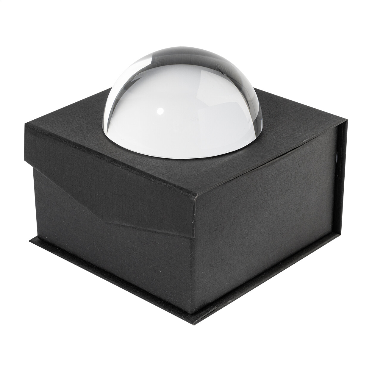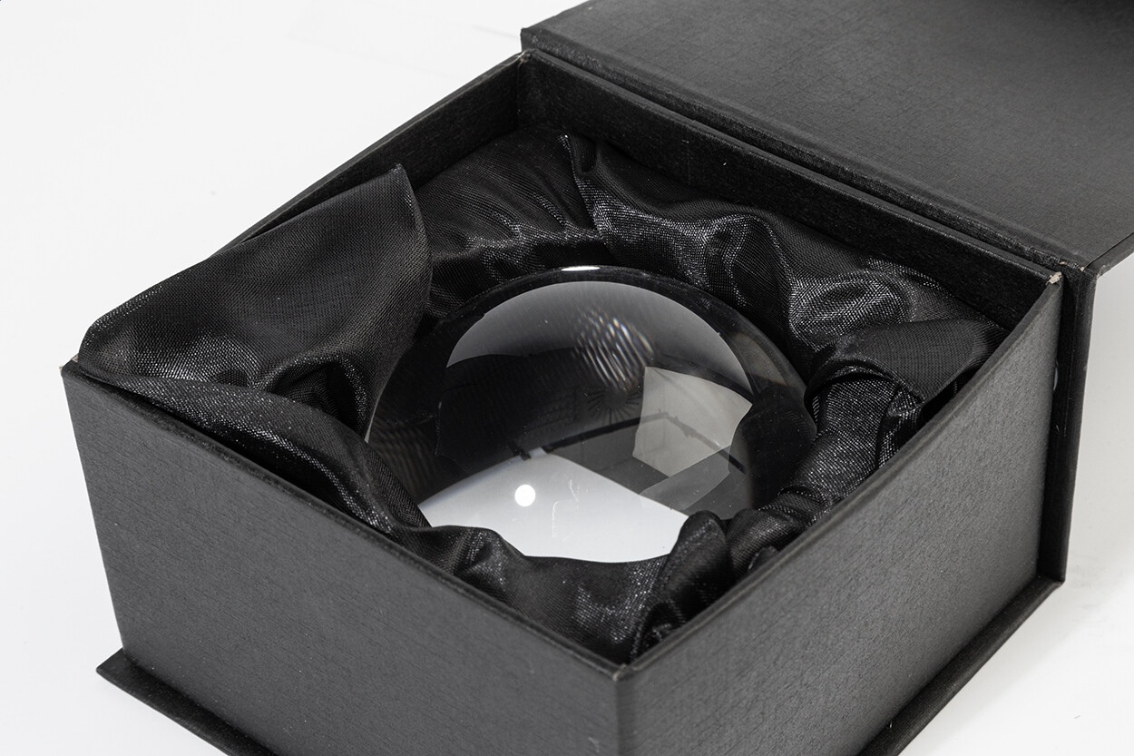 Presse-papier et loupe en verre. Dans un coffret cadeau en papier noir avec une doublure en velours et une fermeture magnétique.