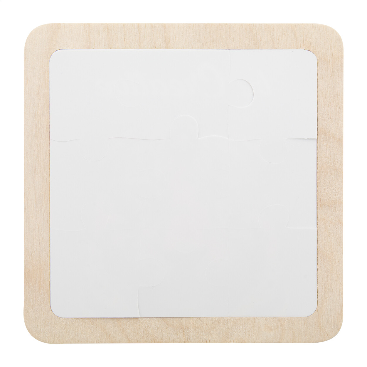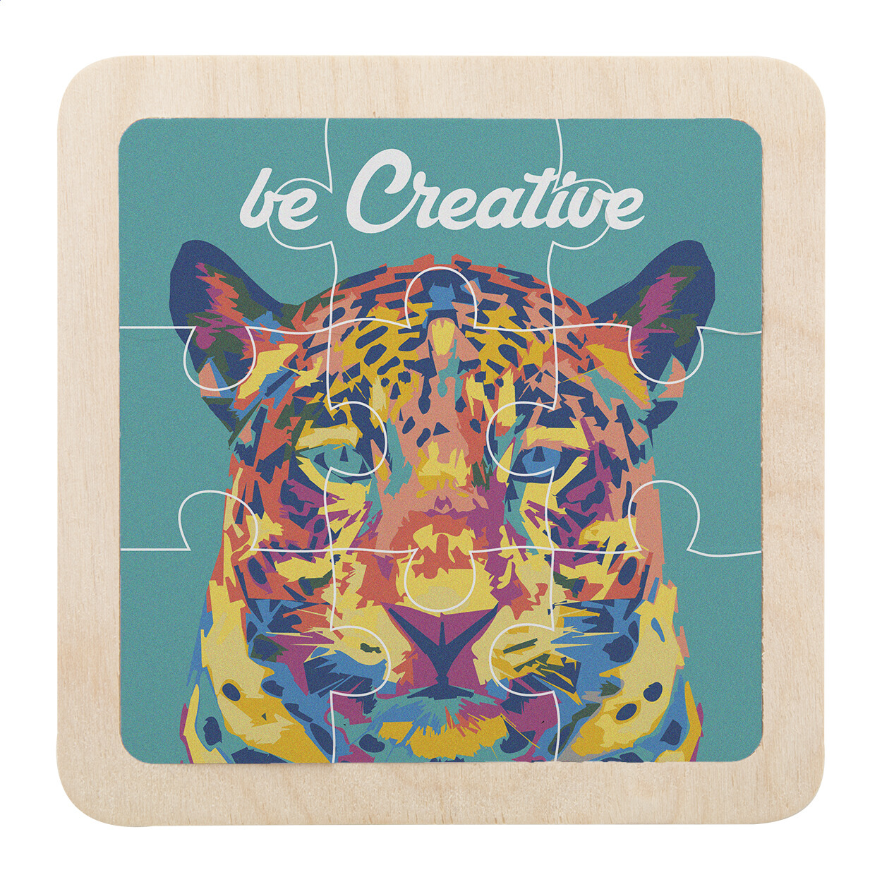 Puzzle en bois et plastique de 9 pcs. Marquage possible sur le puzzle en plastique. Support en bois de bouleau laminé. Le prix inclut l'impression UV Led. Quantité minimum : 100 pcs.