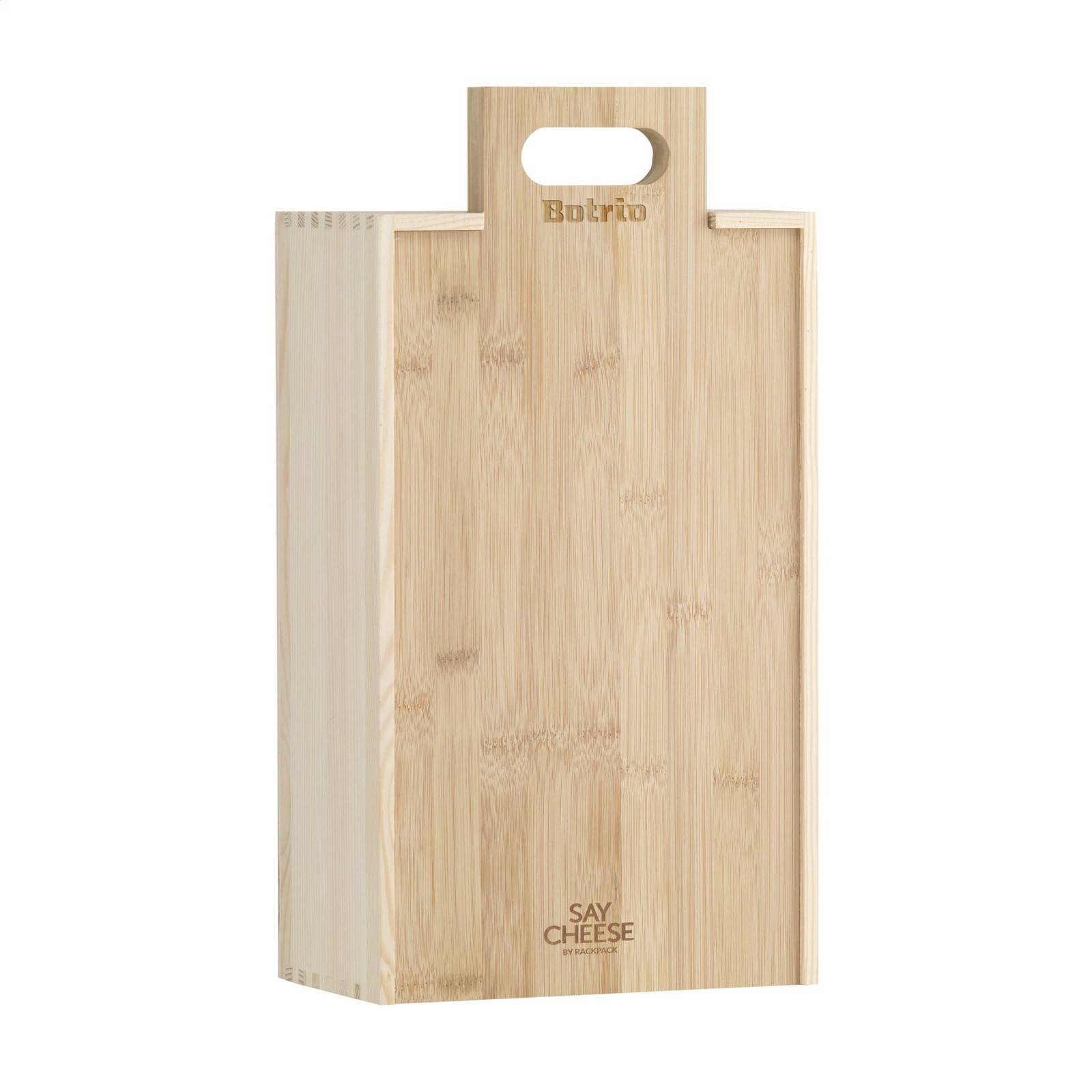 Rackpack Say Cheese : coffret cadeau à vin et un plateau de fromages en un produit. Say Cheese est un coffret cadeau en bois avec deux compartiments. Un pour une bouteille de vin et un pour un assortiment de fromages français. Le couvercle de la boîte sert également de planche à découper en bambou, pour présenter et couper le fromage que vous venez de recevoir en cadeau. Bon appétit! Rackpack : un coffret vin en bois certifié FSC 100% avec une nouvelle seconde vie ! • convient pour une ou deux bouteilles de vin • bois de pin de 8 à 10 mm • vin non inclus • contenu non inclus. Emballage par pièce.