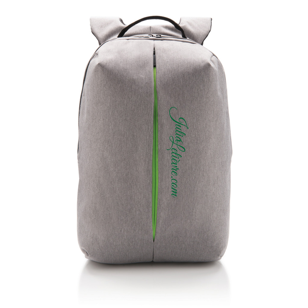 Sac à dos très complet, résistant aux intempéries et anti-vol en polyester 300D Oxford de 2 tons. Avec des fermetures à glissière dissimulées à l’arrière qui compliquent la tâche aux pickpockets et autres accès indésirables. Le compartiment principal est spacieux, il s’ouvre presque intégralement, et il est pourvu d’un poche en mousse pour un pc portable jusqu’à 15,6" et pour une tablette jusqu’à 12", d’une poche zippée et de diverses poches fendues. À l’avant du sac à dos, une poche zippée, des accents réfléchissants pour la sécurité dans l’obscurité et, sur le côté des poches en mailles pratiques pour emporter une gourde. Aussi bien la face du dos que les sangles d’épaule sont pourvues de mousse résistante et finies d’un filet en mailles. Sur le haut et dans les deux sangles d’épaule, des poches zippées de blocage RFID ont été intégrées pour prévenir le « clonage ». Avec un fond renforcé, une boucle de transport et une boucle supplémentaire pour attacher le sac à dos à un trolley. Un Port USB avec câble de chargement est inclus. Ce sac a une belle finition, il résiste aux intempéries, il est parfaitement doublé et son confort est garanti. Capacité env. 20 litres.