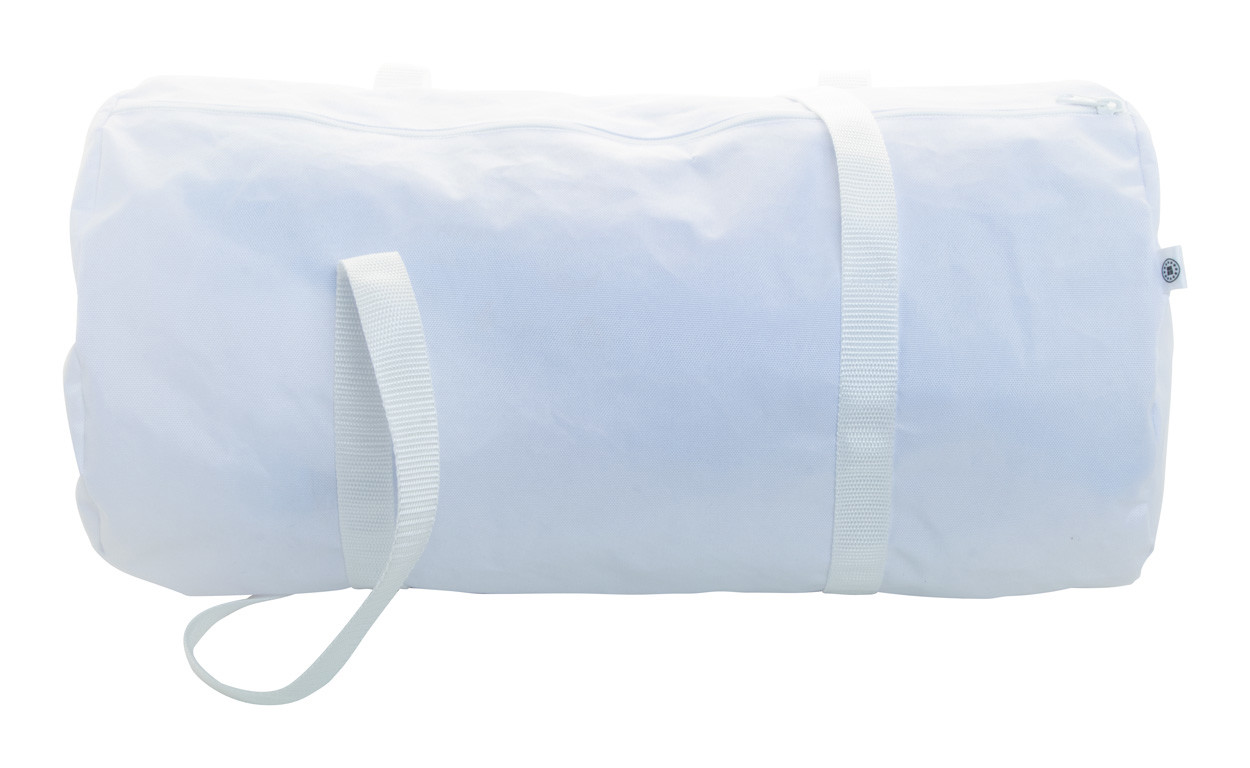 Sac de sport zippé sur mesure en polyester RPET 600D avec anses longues. Impression en sublimation et labélisé RPET. Quantité minimale : 25 pièces.