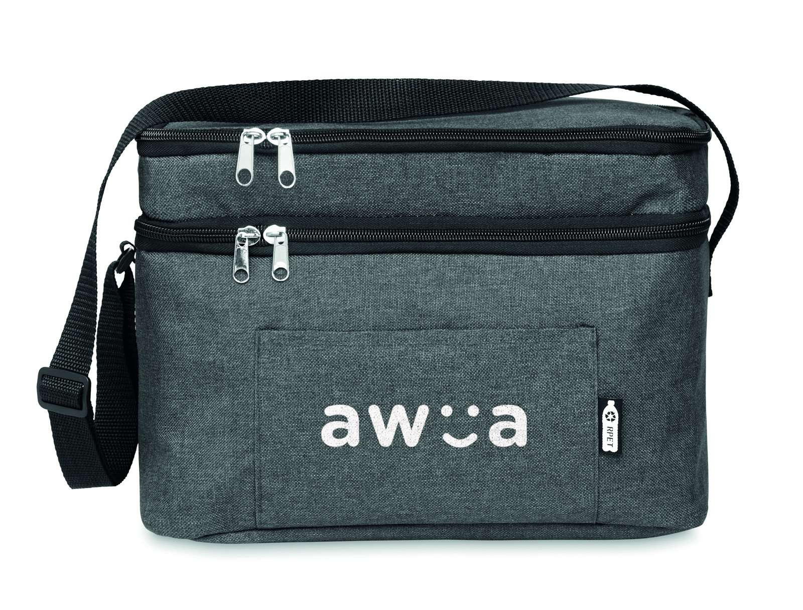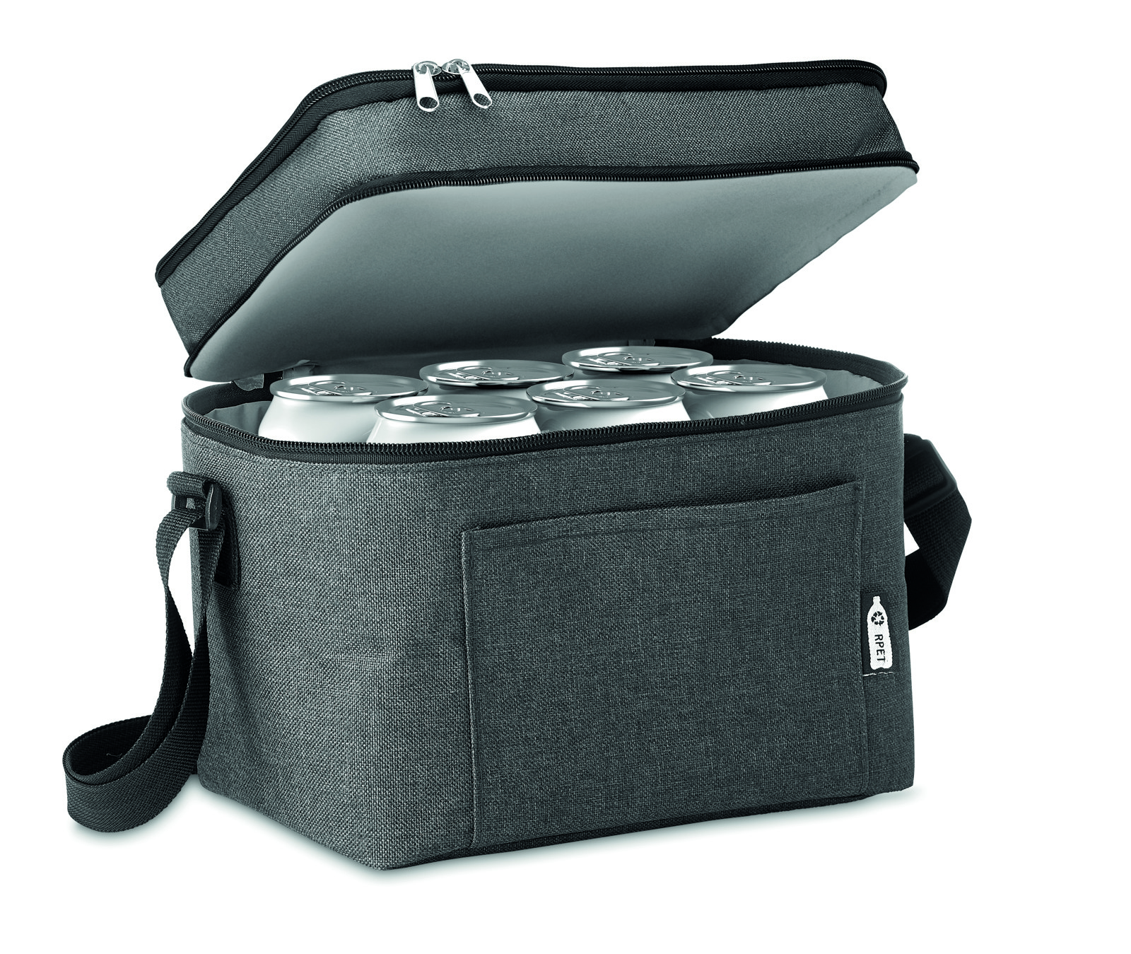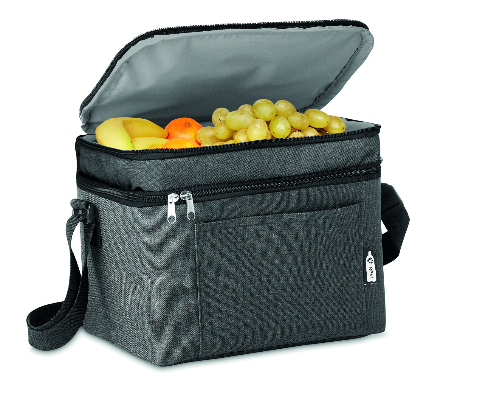 Sac isotherme 2 tons en RPET 600D avec 2 compartiments et doublure en PEVA. Bandoulière réglable et poche frontale. Capacité 3L. Matériau isolant : PEVA 0 ,15 mm PEVA + 3 mm de mousse.