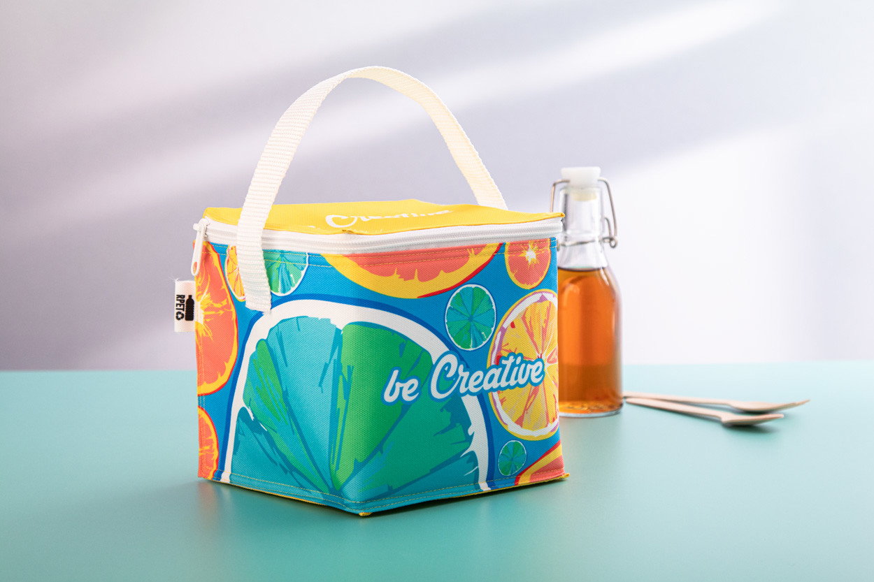 Sac isotherme zippé sur mesure en polyester RPET 600D doublé en aluminium et pour 4 cannettes 0,33 L. Impression en sublimation sur toute la surface et labélisé RPET. Quantité minimale : 25 pièces.