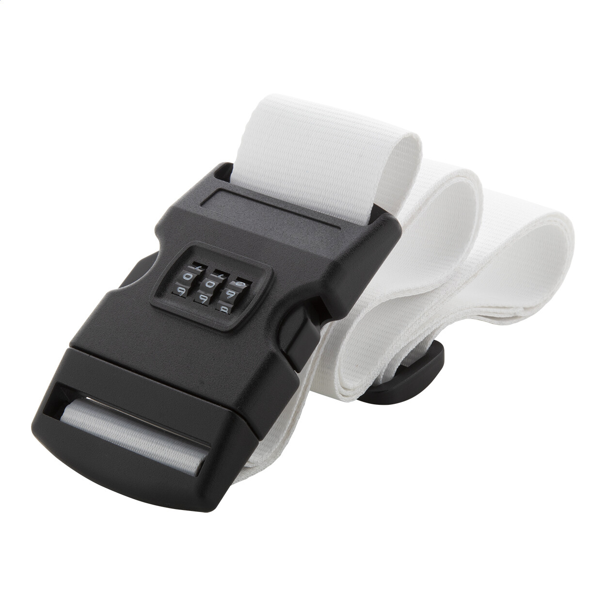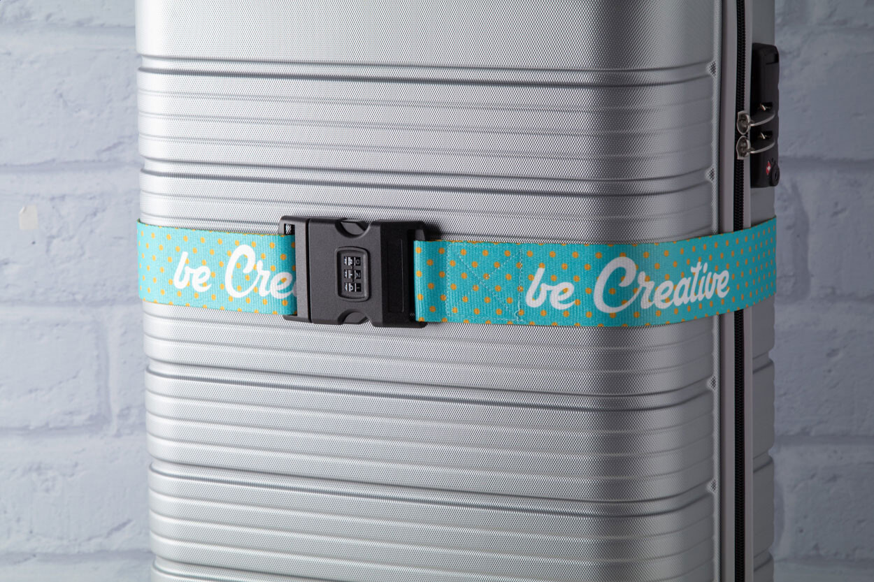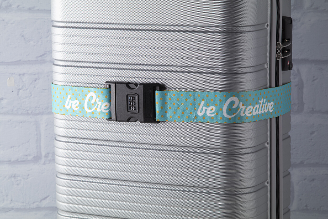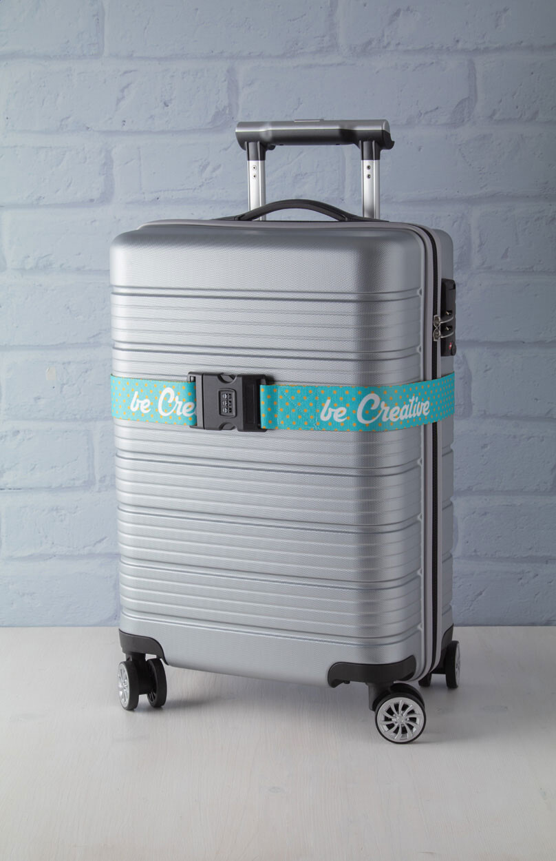 Sangle réglable pour valise en polyester avec fermeture à code 3 chiffrres. Grâce à la sublimation le logo peut être imprimé sur les deux côtés. Quantité minimale: 50 pcs.