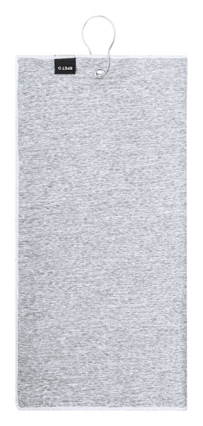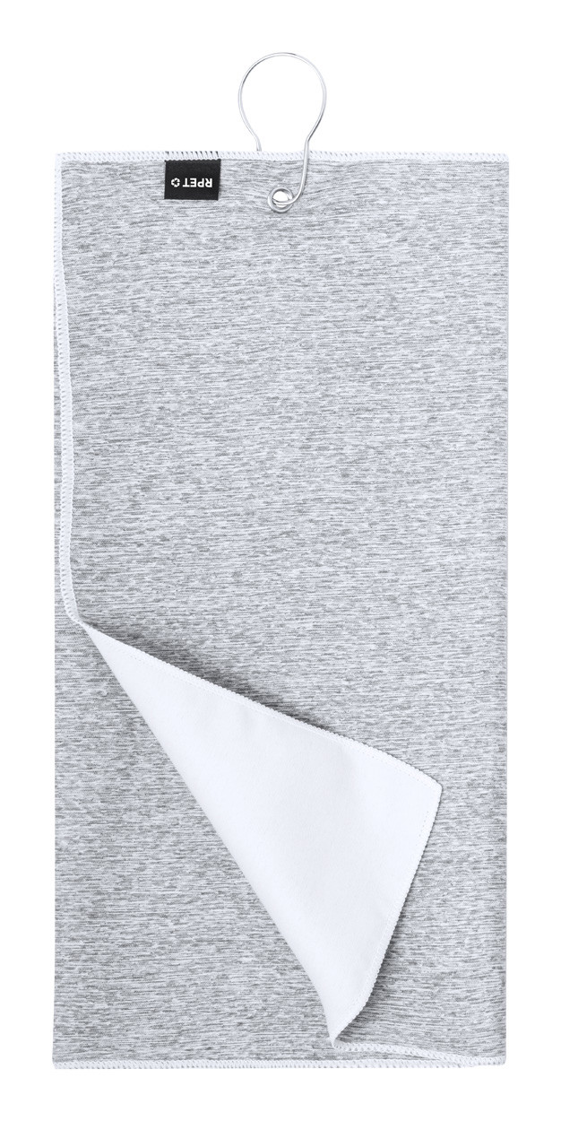 Serviette de golf en polyester RPET avec crochet métallique, 200 g/m². Pochette pour balle de golf à coque souple et avec mousqueton.