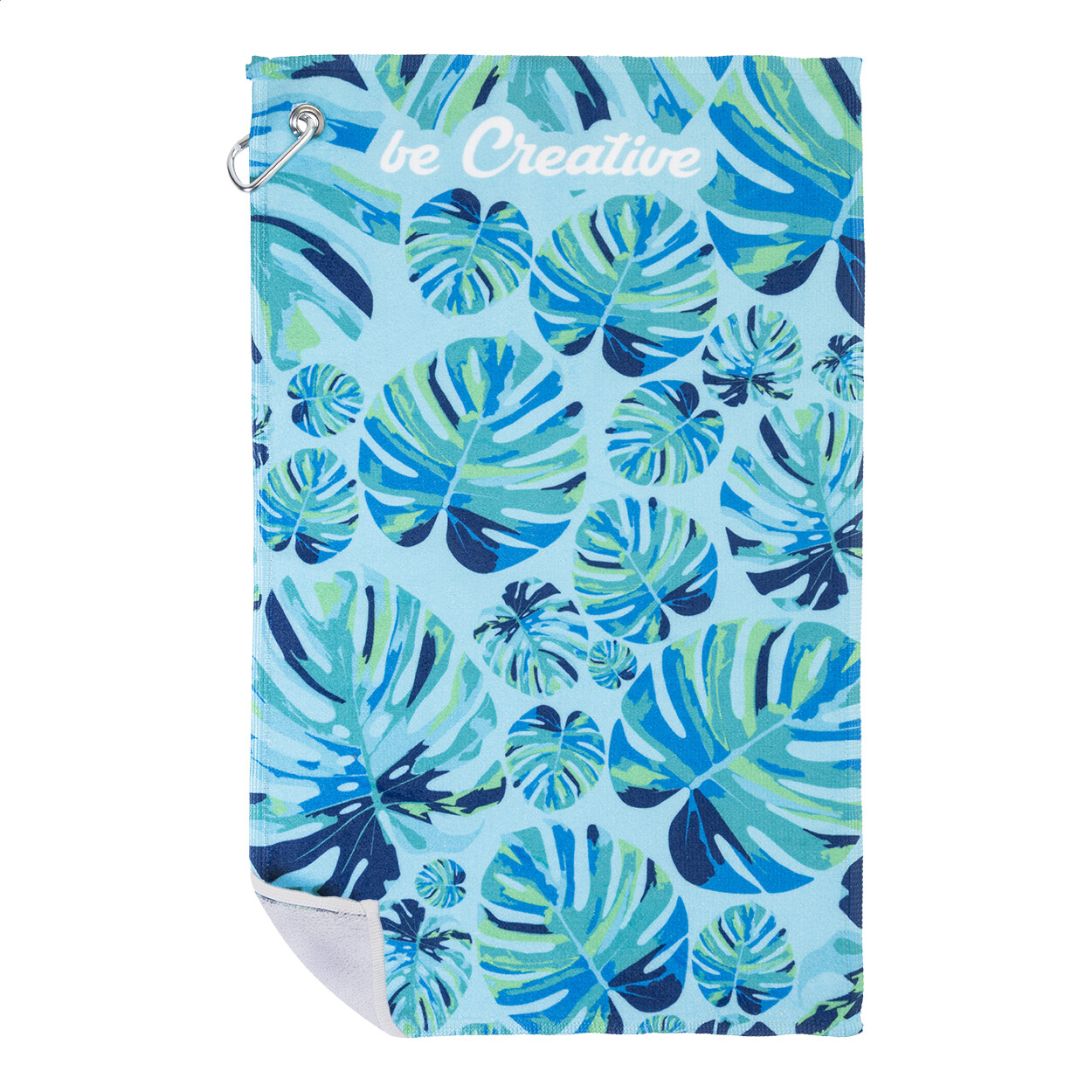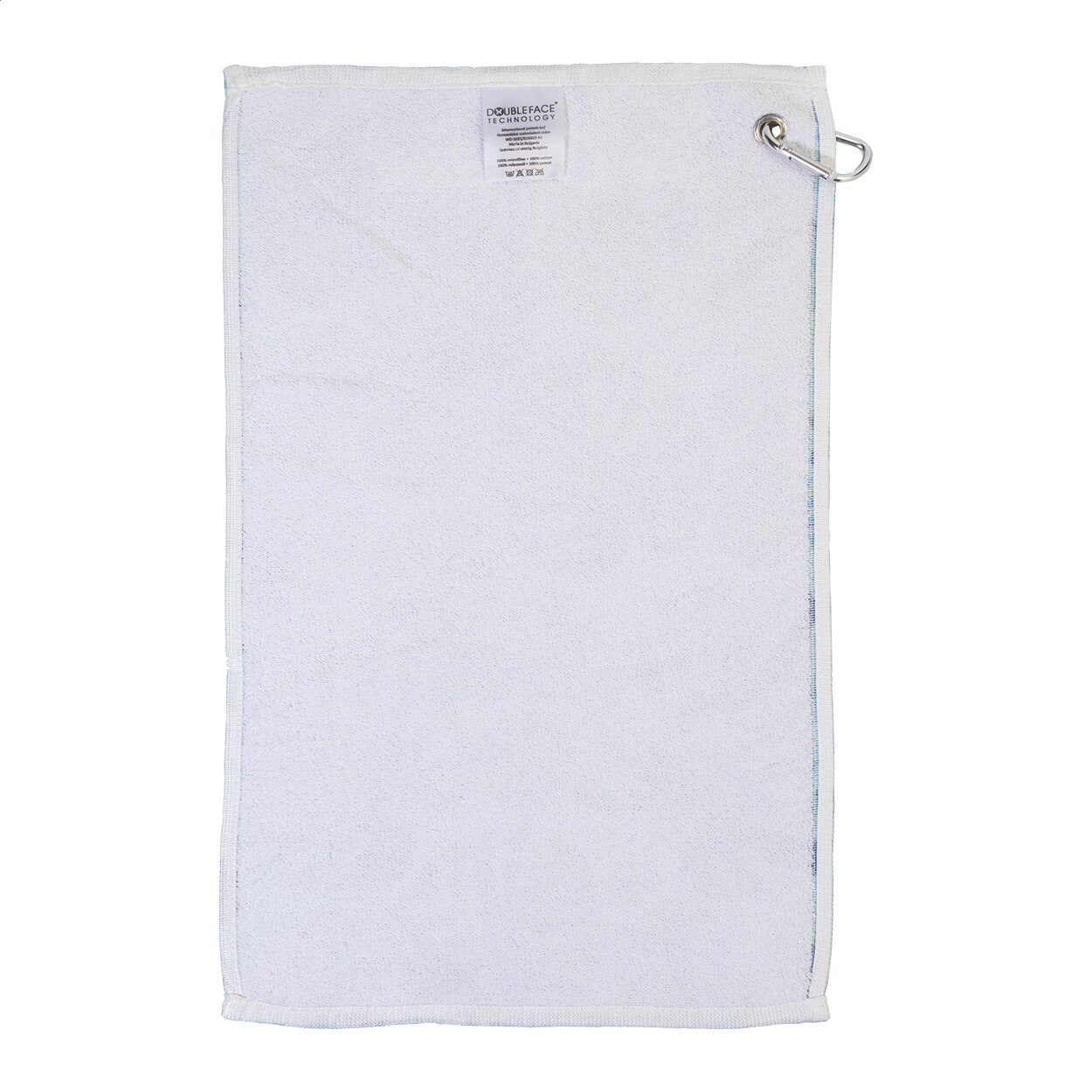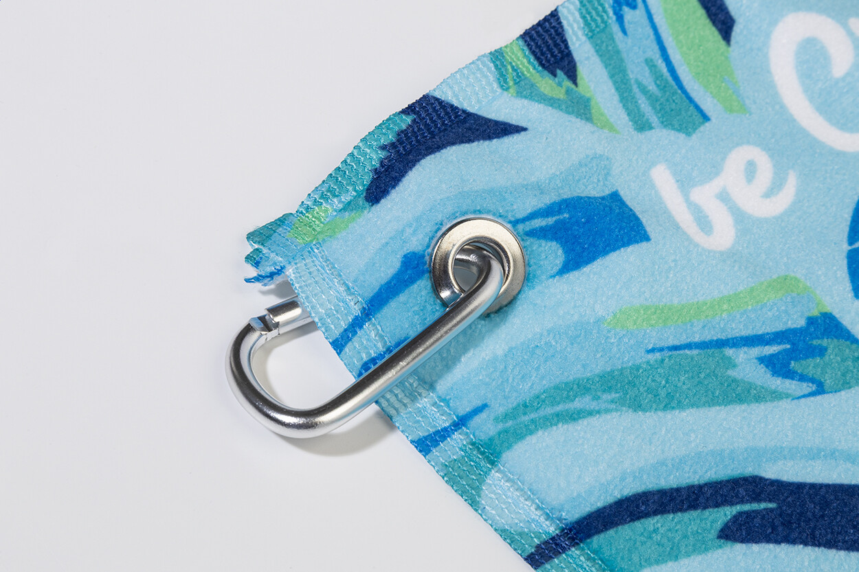 Serviette de golf double face avec cintre en métal et impression en sublimation sur un côté. 100% coton + 100% microfibre, 400 g/m². Le prix comprend l'impression en sublimation. Quantité minimale : 50 pièces.