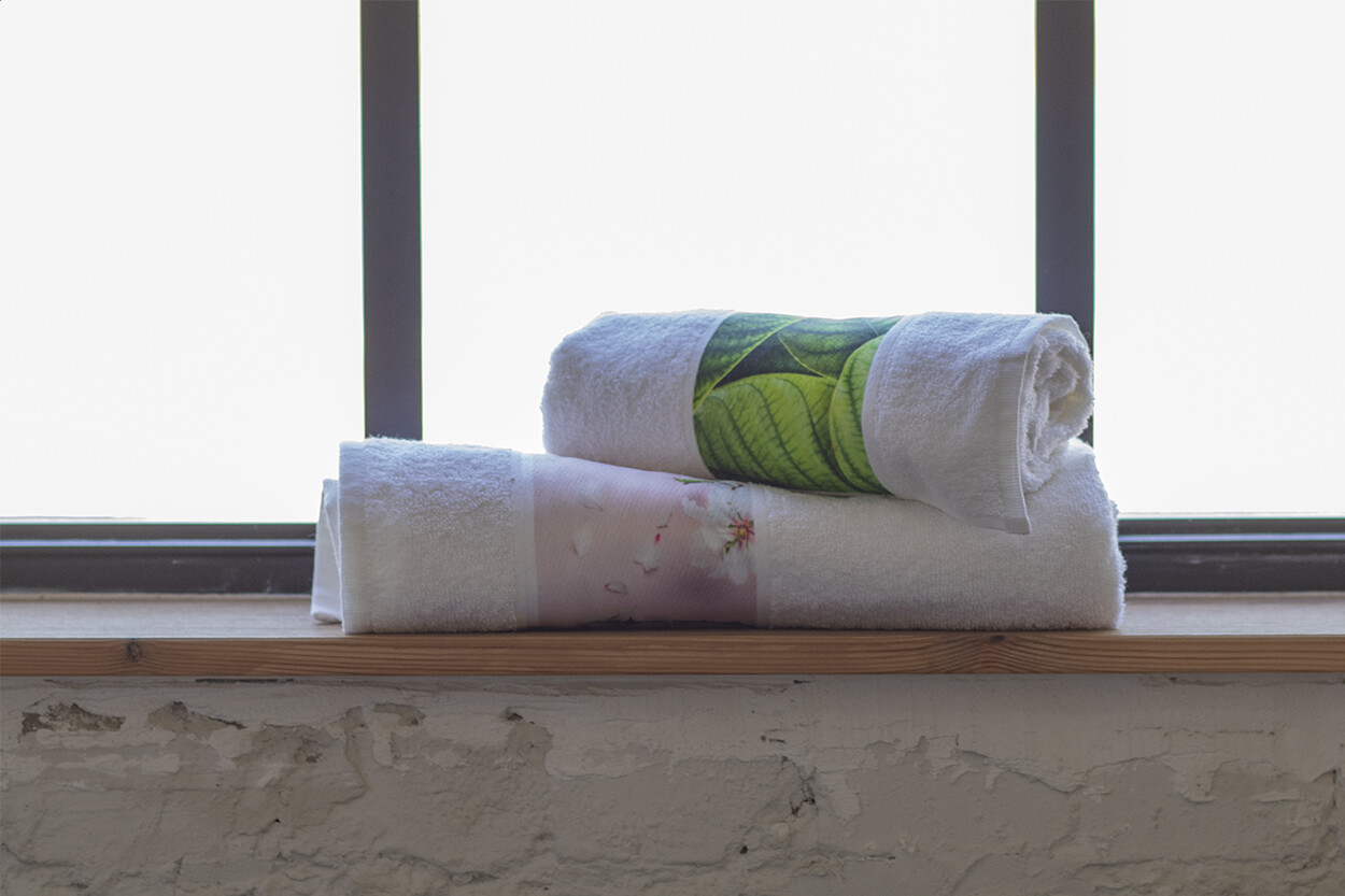Serviette éponge, 400 g/m² 100% coton avec bord en polyester pour l'impression en sublimation. Le prix comprend une impression en sublimation. Quantité minimale 25 pcs.