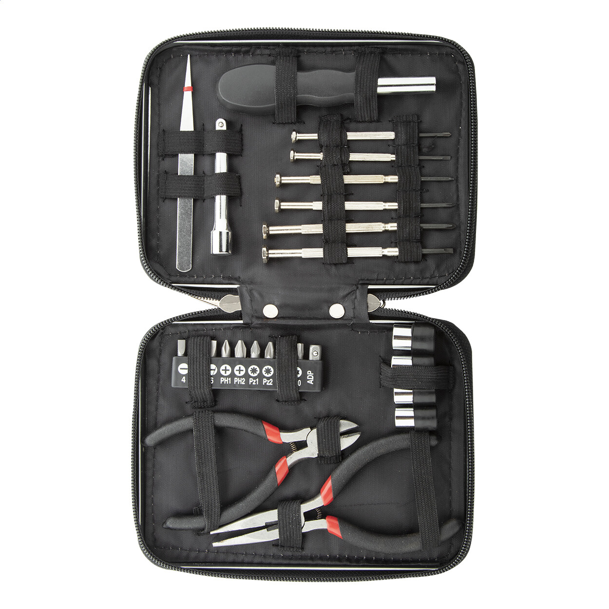 Set à outils en métal de 25 pièces dans un boîtier en aluminium zippé. Comprend : pince à bec, pince coupante, tournevis à douille, rallonge, pince, 6 tournevis de précision, jeu de douilles d'écrou 4 pièces, jeu d'embouts de tournevis 10 pièces.
