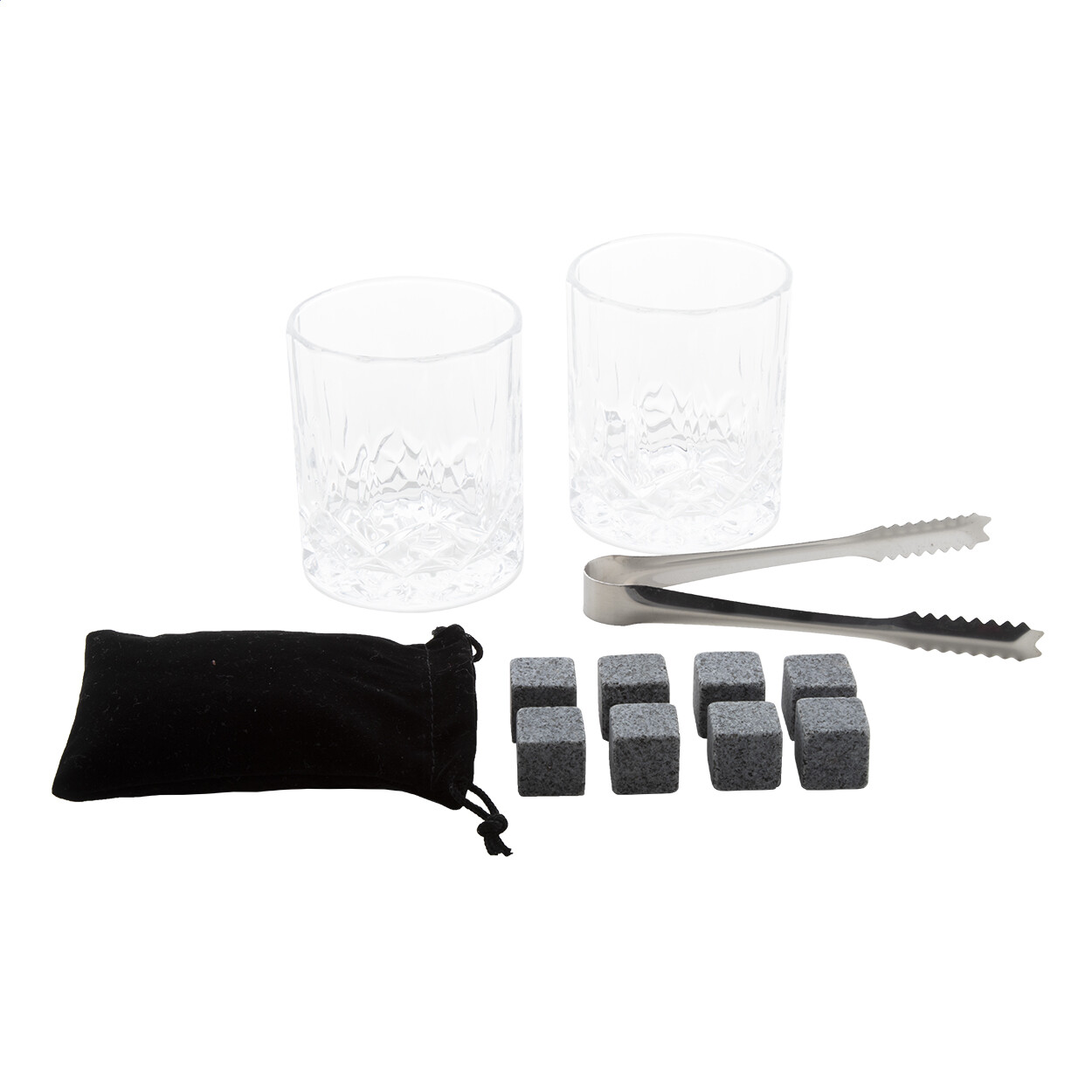Set à whisky de luxe dans une boîte cadeau en bambou. Comprend 2 verres à whisky (250 ml), 8 glaçons "pierre" réutilisables avec pochette de rangement et une pince en acier inoxydable.