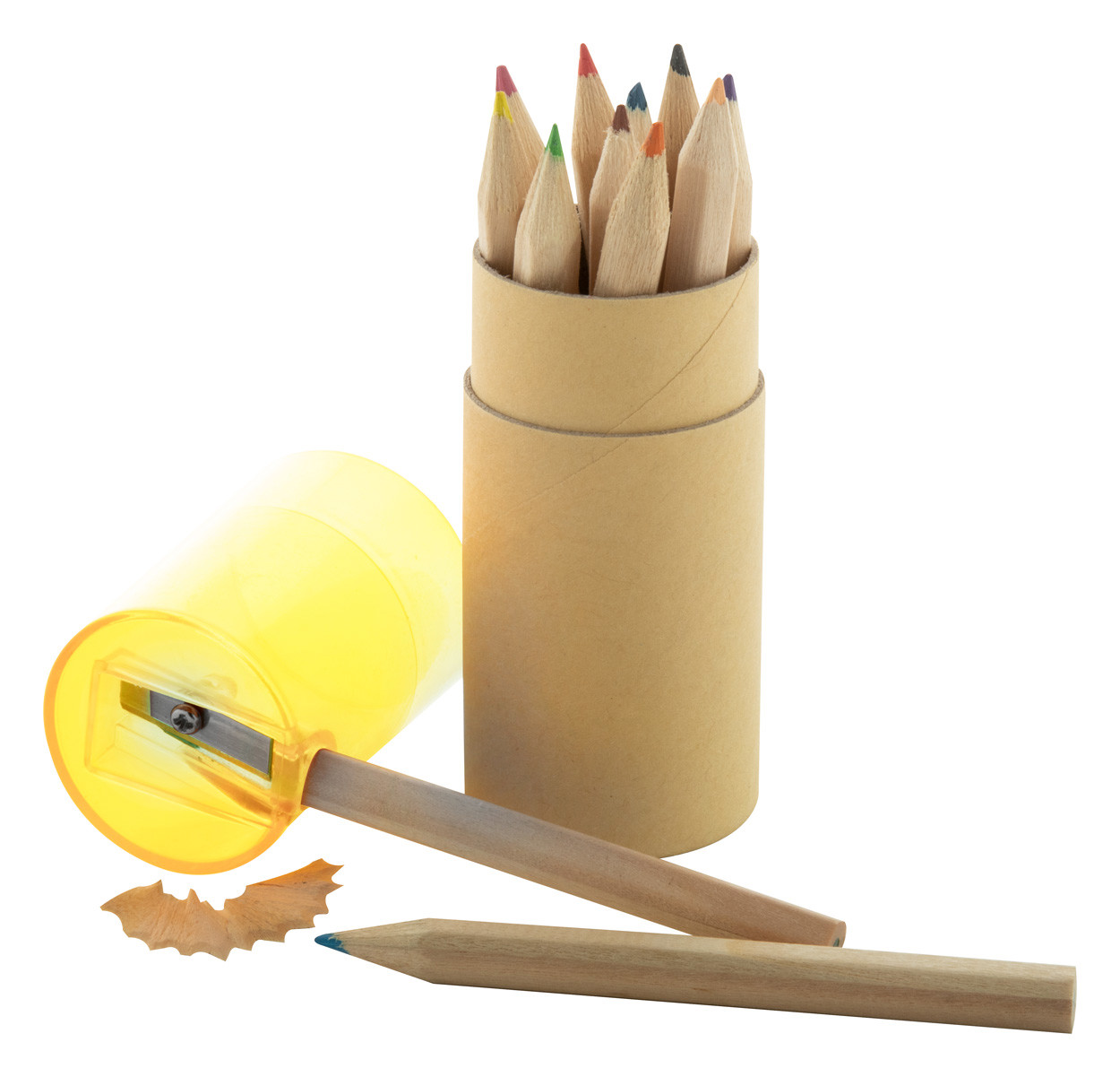 Set de 12 crayons de couleur dans un étui rond en carton avec taille-crayon en plastique.
