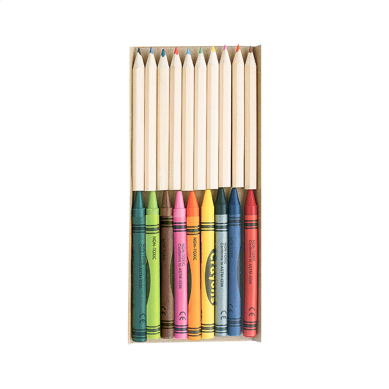 Set de crayons de couleurs (10 pièces) et crayons (9 pièces) dans une boîte en carton recyclé avec fenêtre.