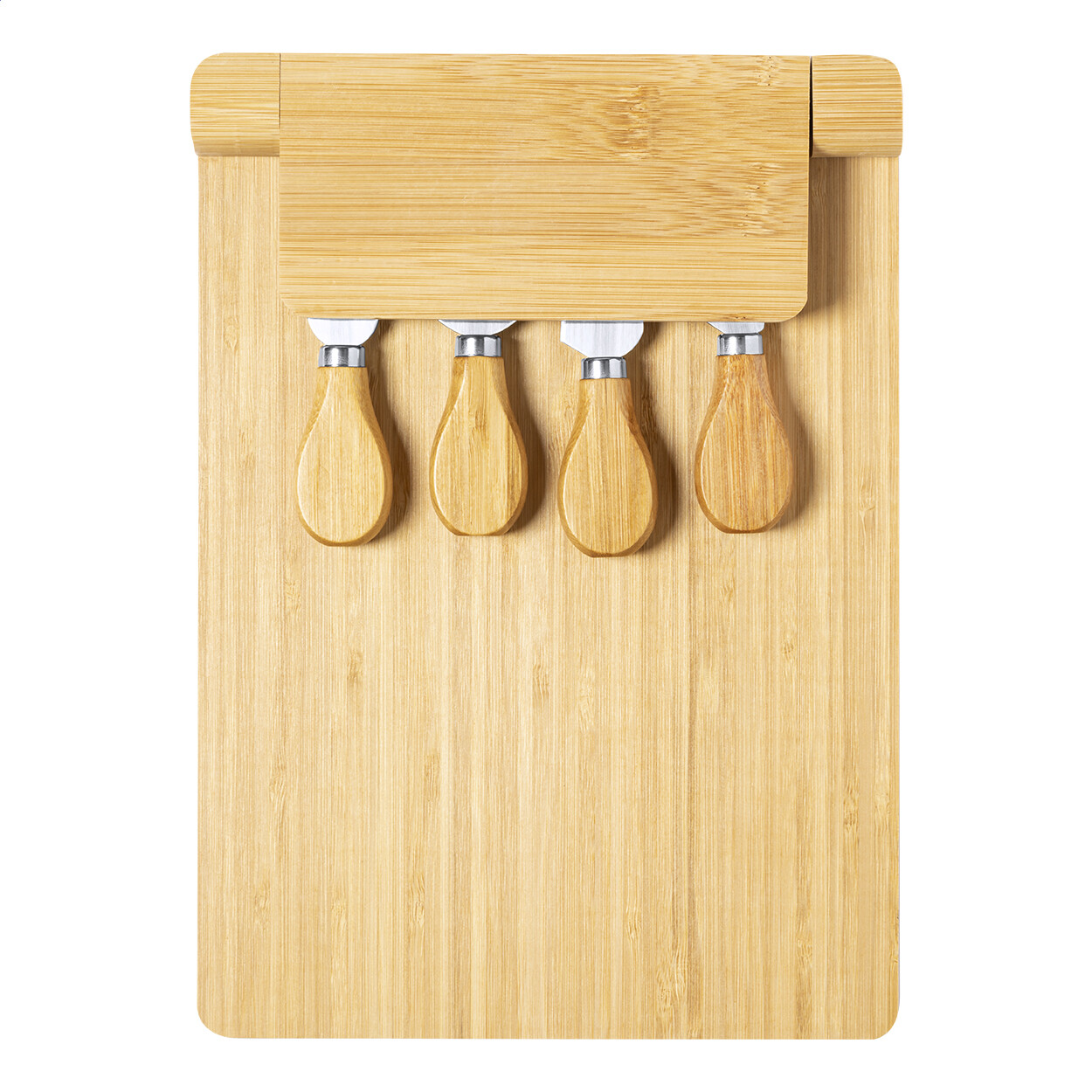Planche à découper en bambou avec 4 couteaux à fromage en acier inoxydable sur support magnétique pliable.