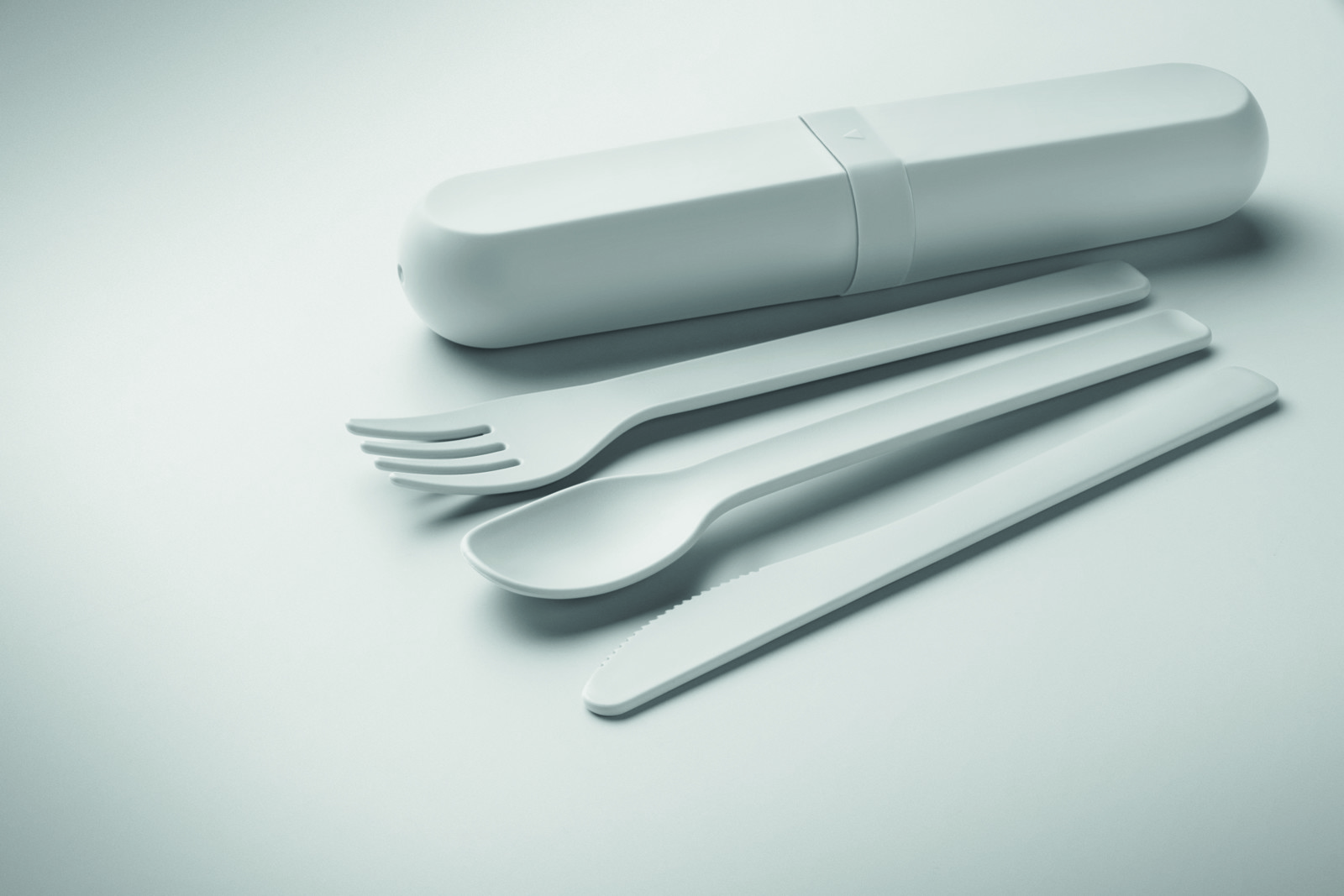 Set de couverts réutilisables avec étui en PLA de maïs. Chaque set comprend une fourchette, un couteau, une cuillère et un étui.