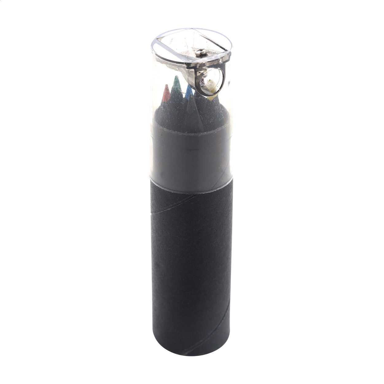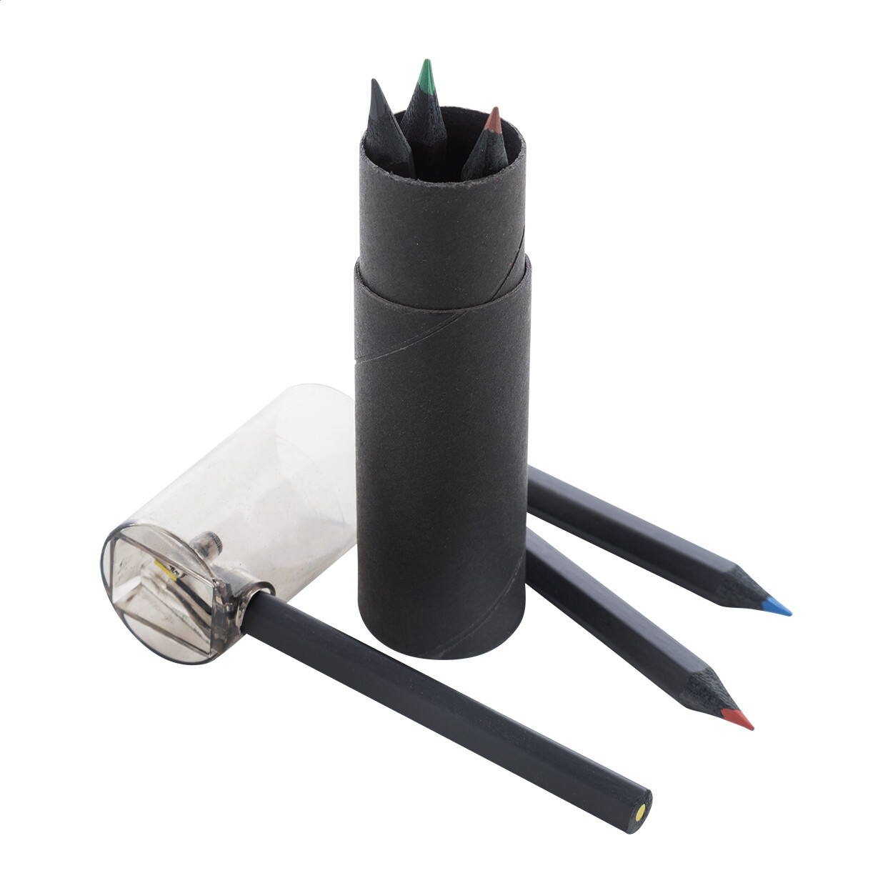 Ensemble de 6 crayons de couleur en bois noir dans un étui rond en carton noir avec taille-crayon en plastique.