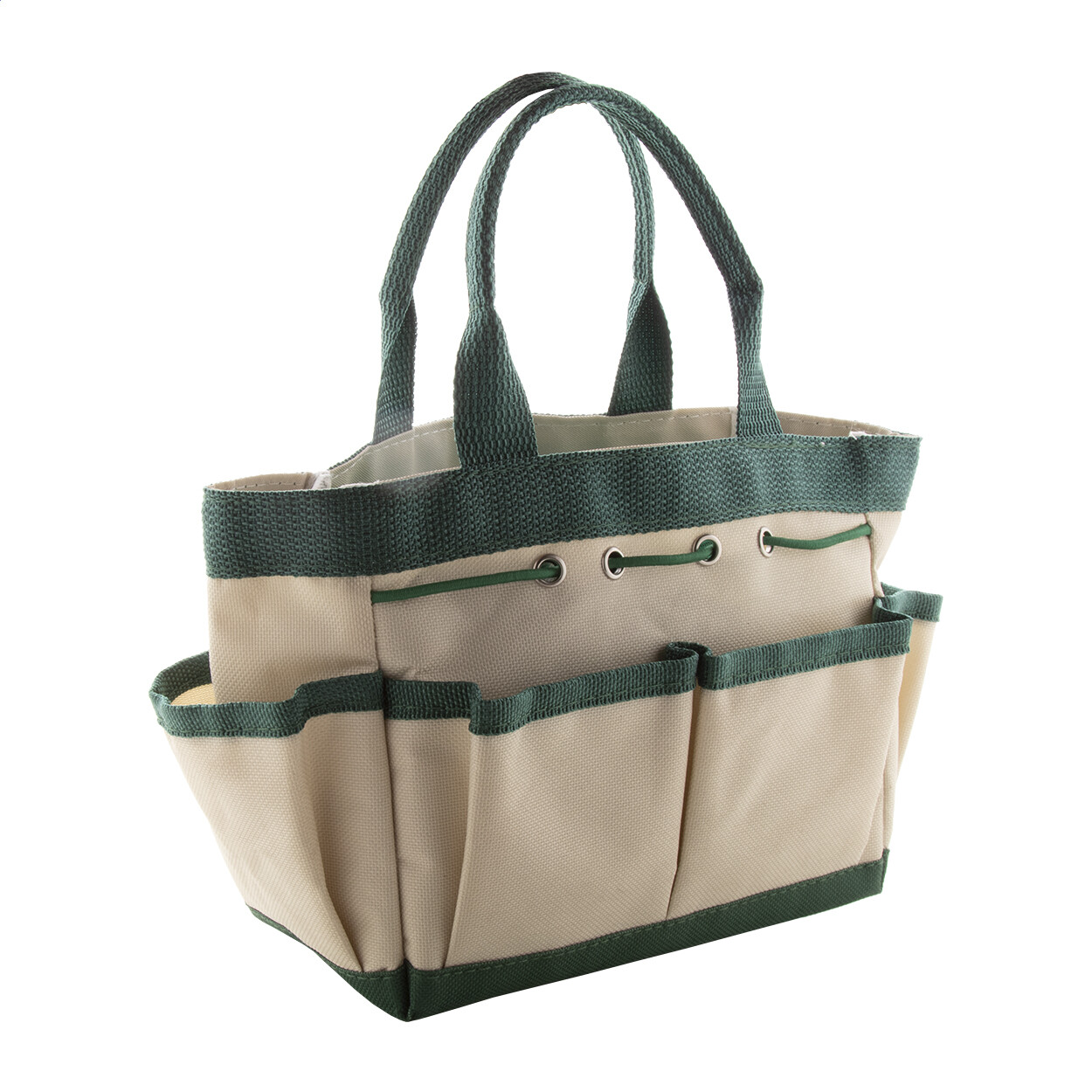 Set d’outils de jardin dans un sac de rangement en nylon. Il comprend des ciseaux pour élaguer, un râteau, 2 petites pelles, une bobine de fil de jardinage avec un cutter, un pulvérisateur et une paire de gants.