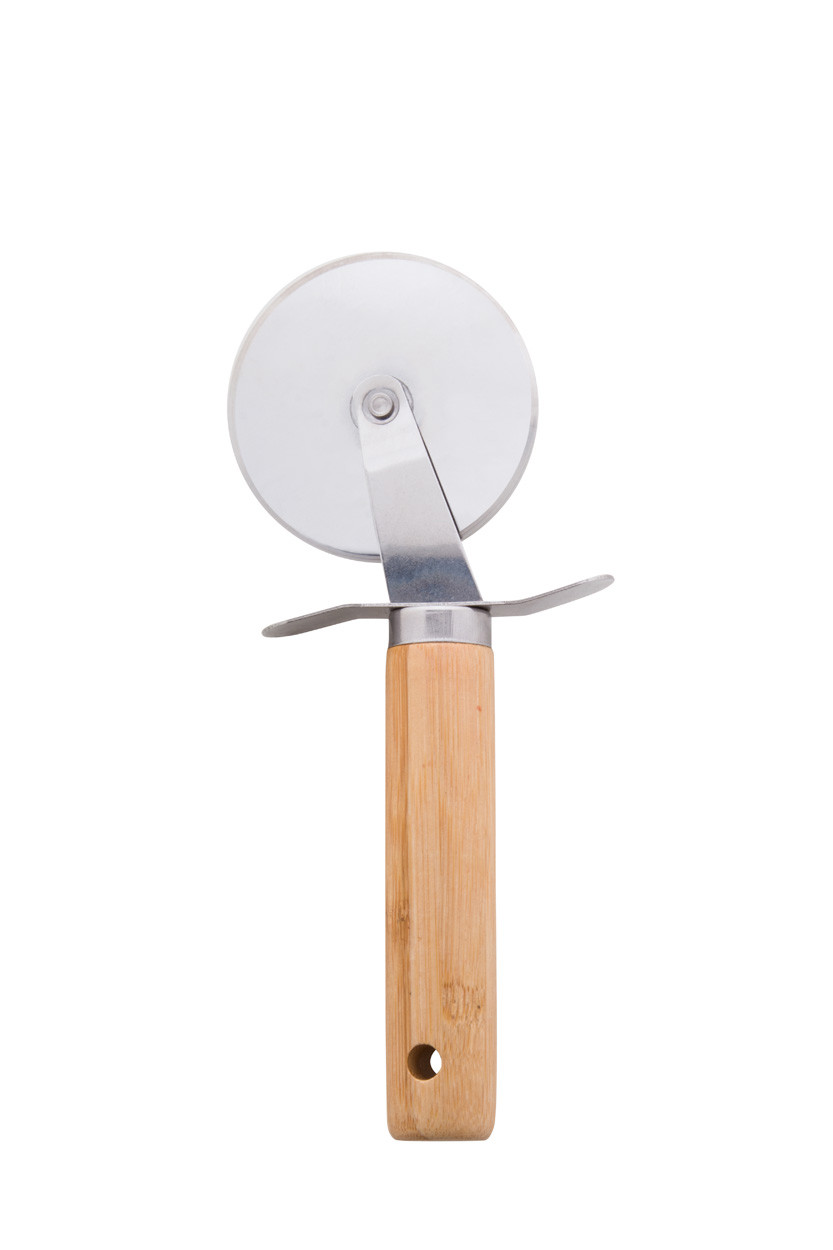 Set de service à pizza avec râpe à fromage, coupe-pizza et spatule en acier inoxydable et manche en bambou, dans une pochette à cordon en coton.
