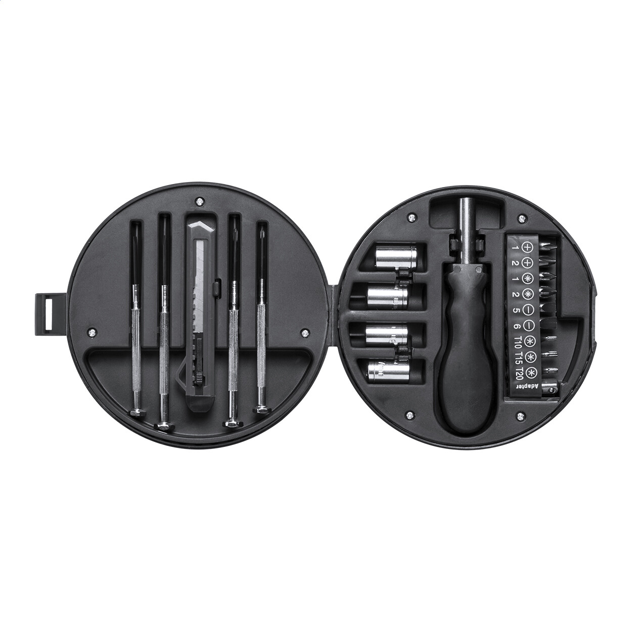 Set de 20 outils dans un étui en plastique en forme de roue de voiture.