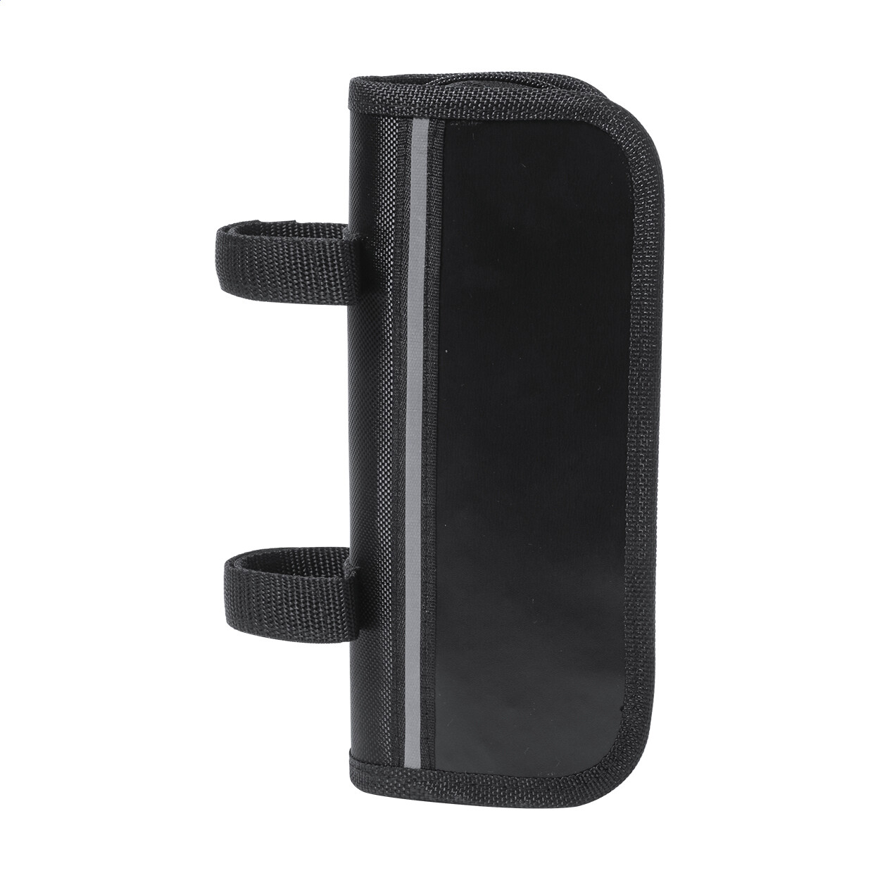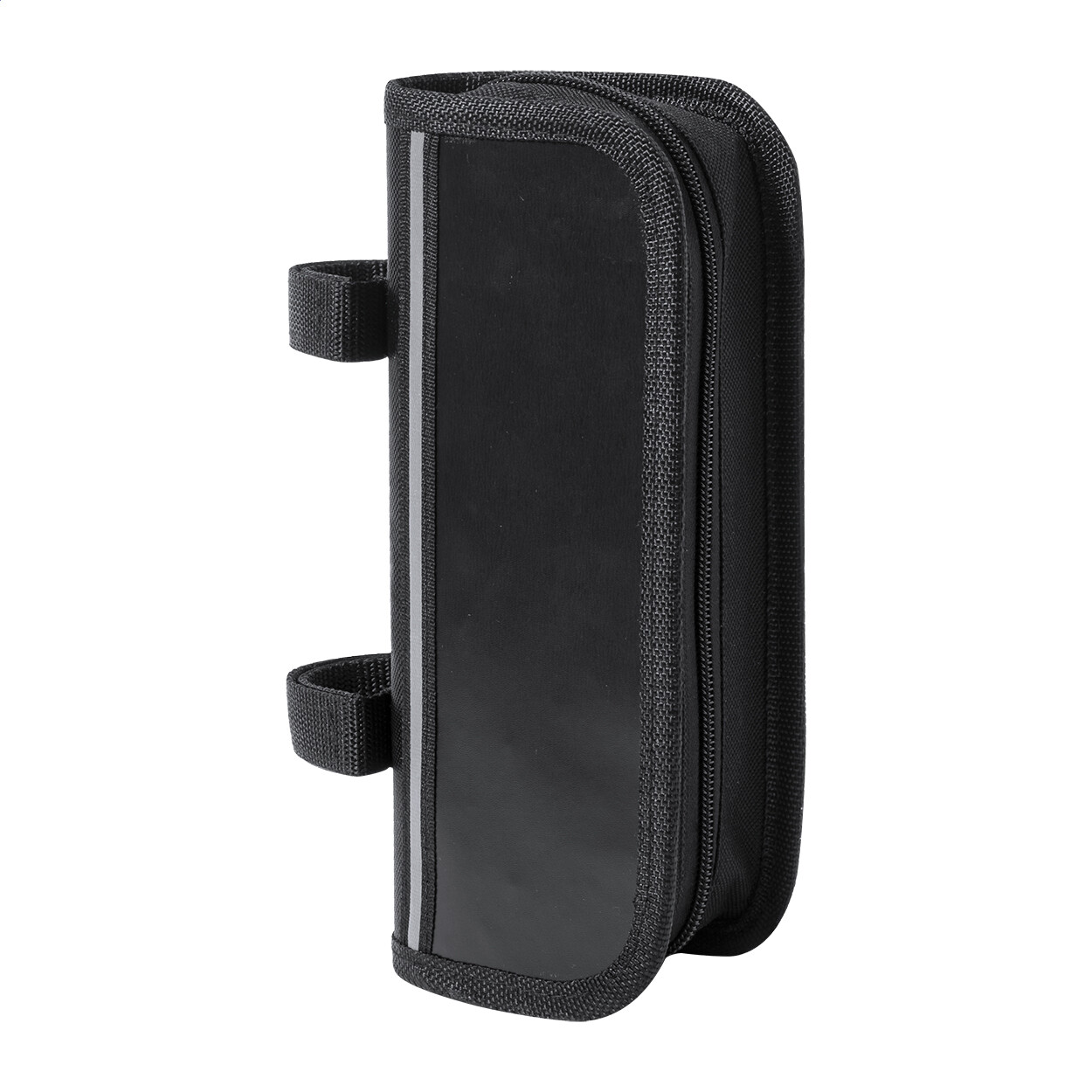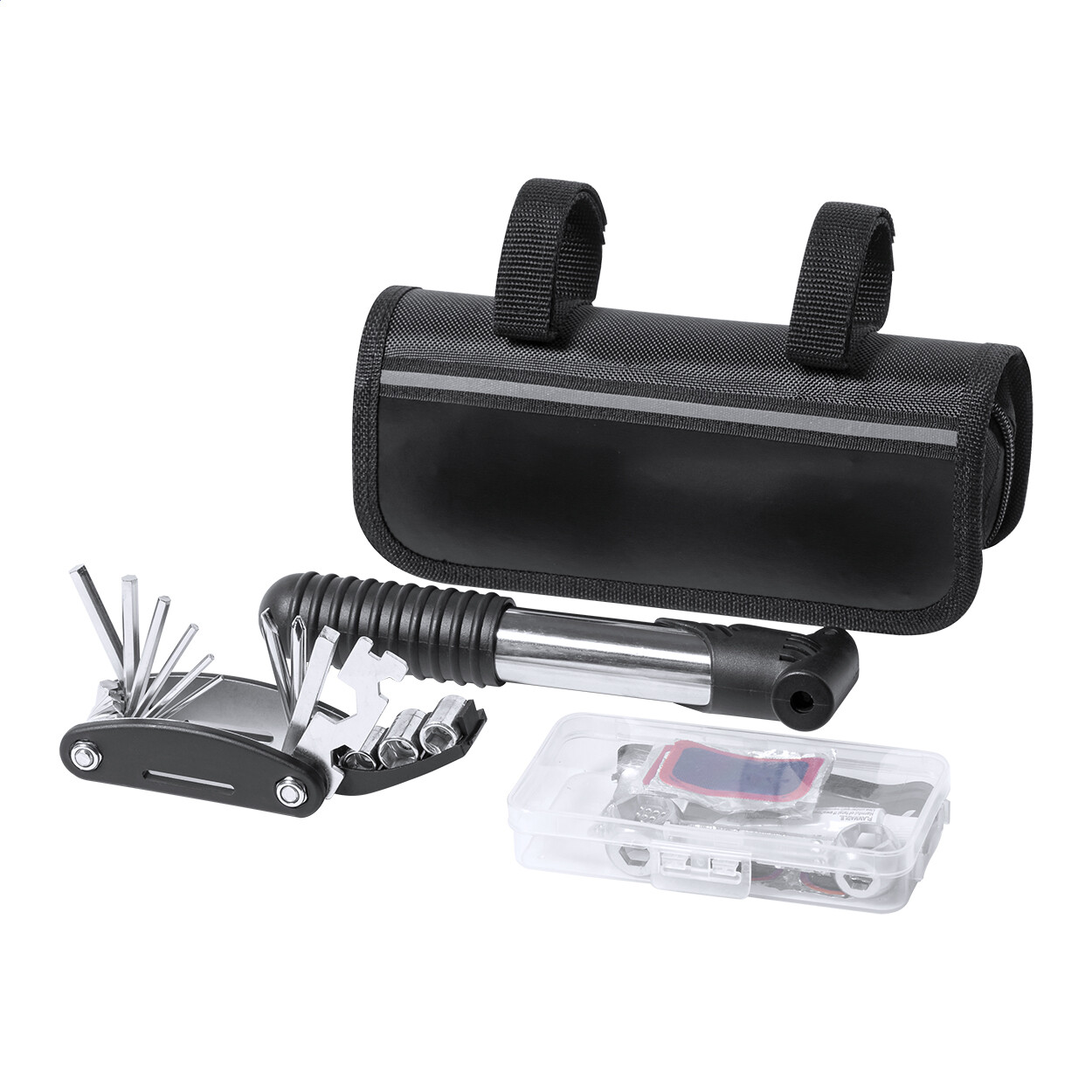 Kit de réparation de vélo dans un sac de cadre de vélo. Comprenant : outil multifonction 15 fonctions, clé hexagonale, mini pompe et kit de réparation de crevaison (2 démonte-pneus, râpe et 6 patchs). Polyester 600D.