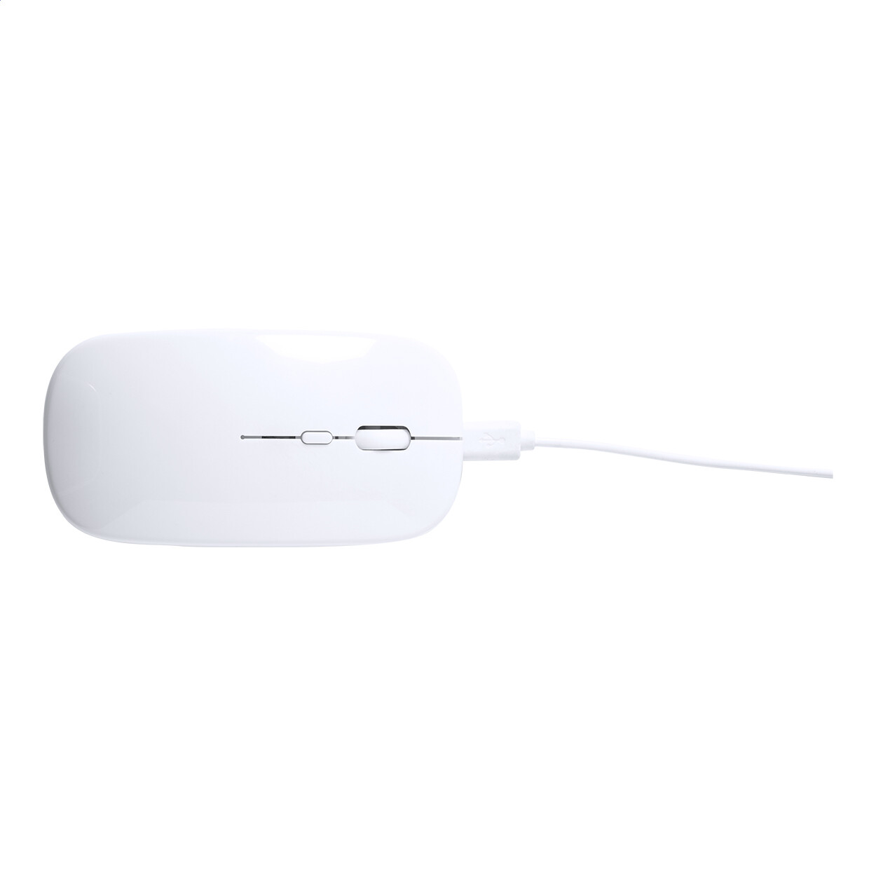 Souris optique sans fil avec boîtier en plastique ABS recyclé et batterie rechargeable intégrée. Câble de chargement USB inclu.