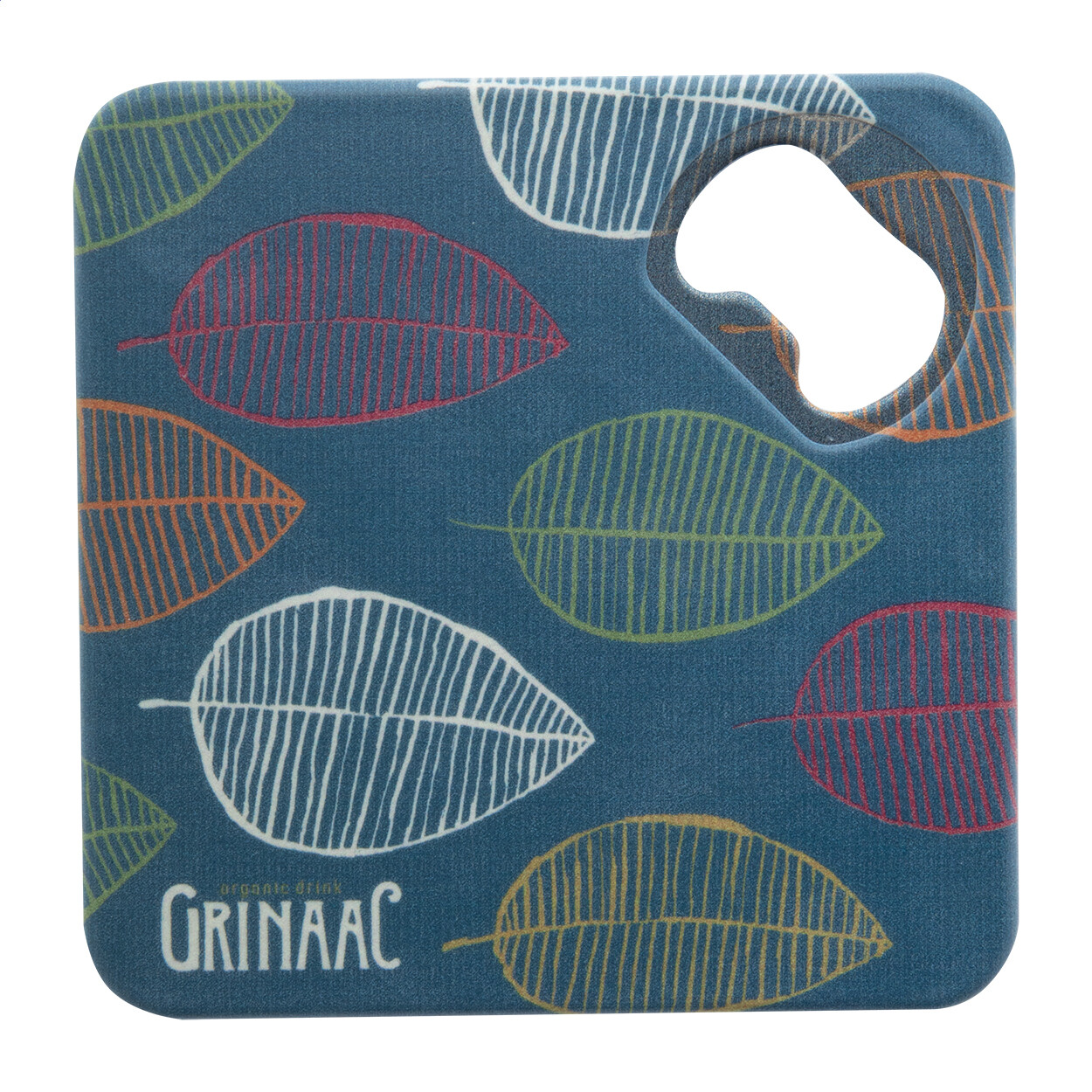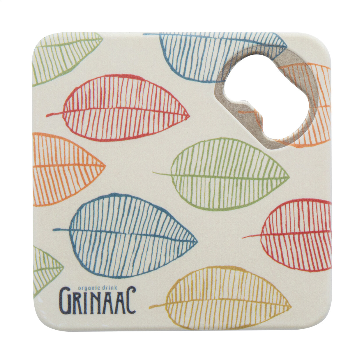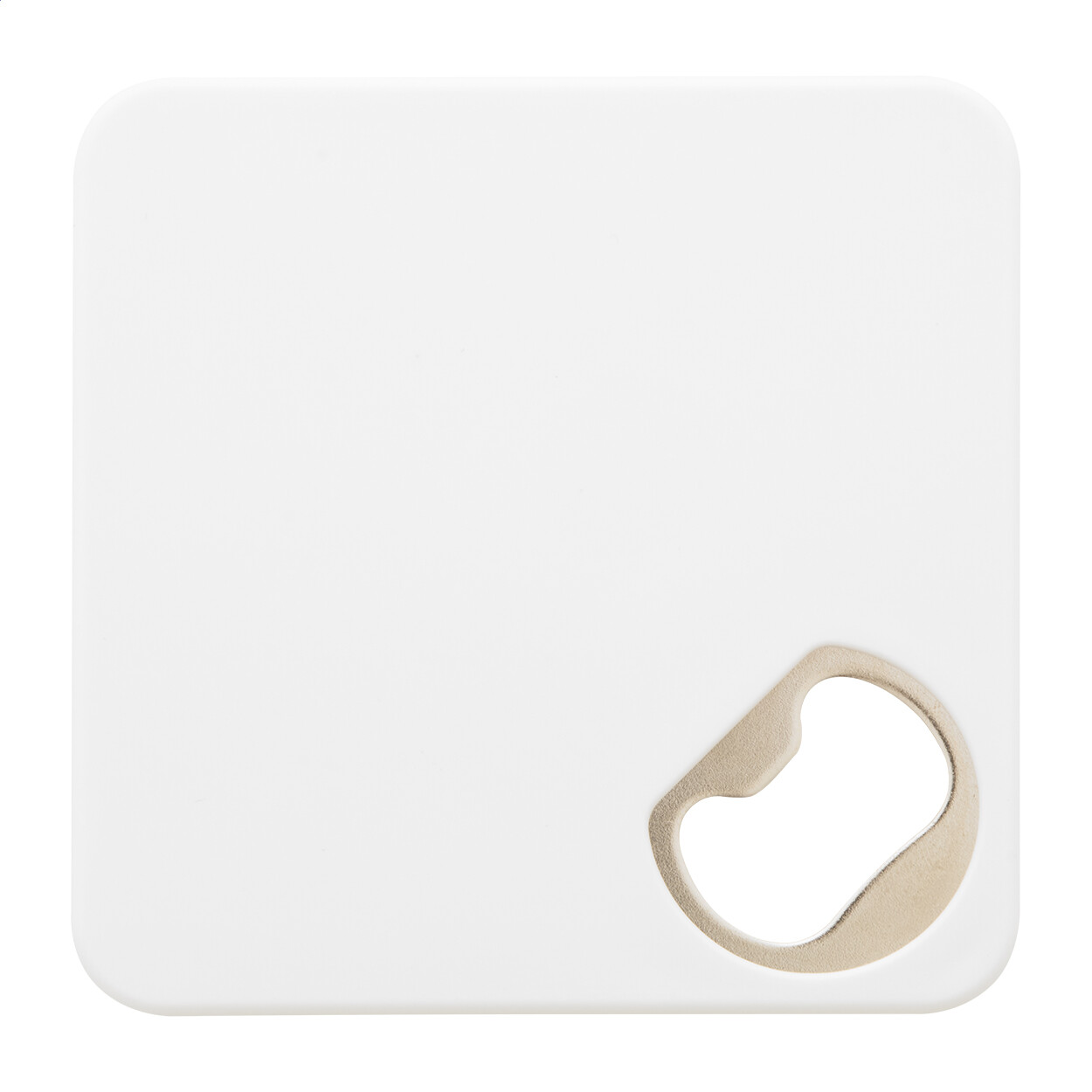 Sous-bock en plastique avec ouvre-bouteille en métal et dessous antidérapant.