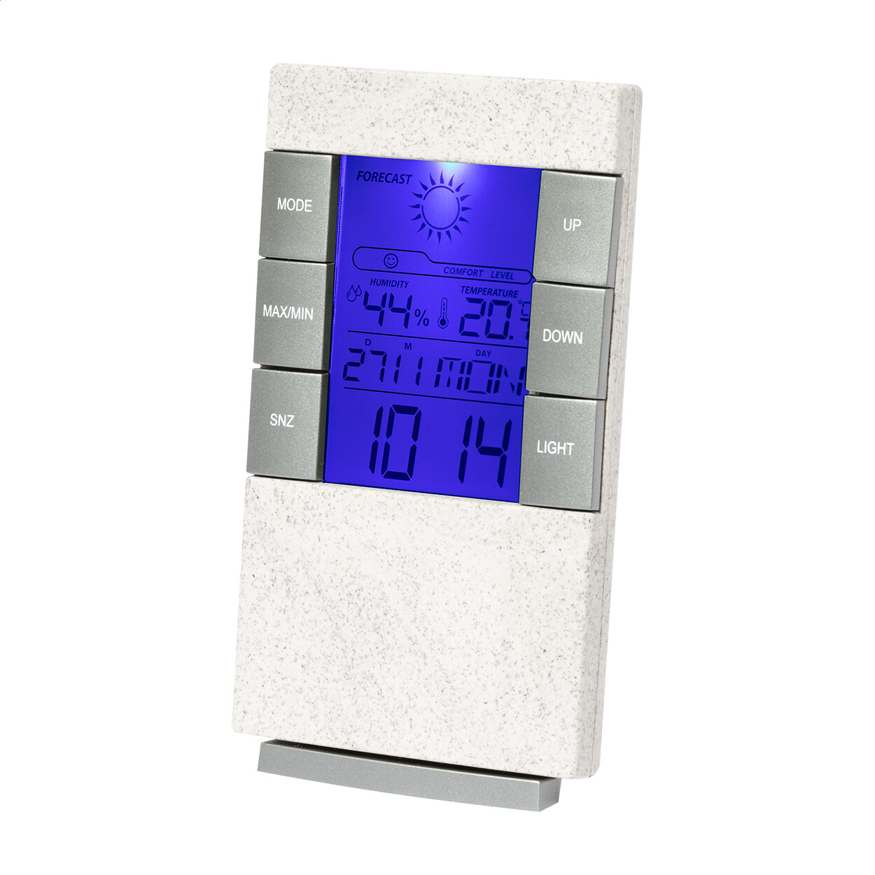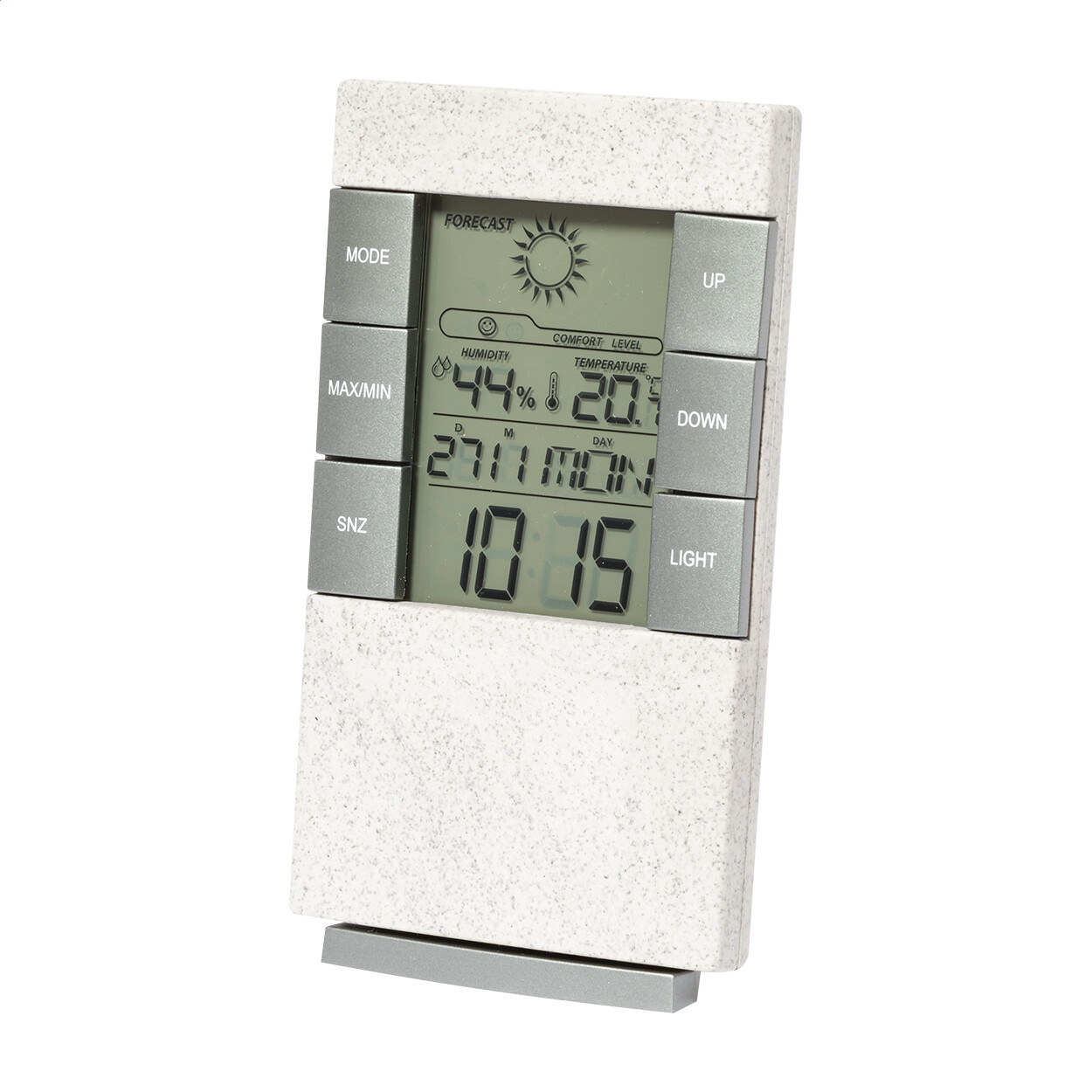 Station météo en plastique écologique en paille de blé avec thermomètre et affichage de l'humidité. Fonctionne avec 2 piles AAA, livrée sans piles.