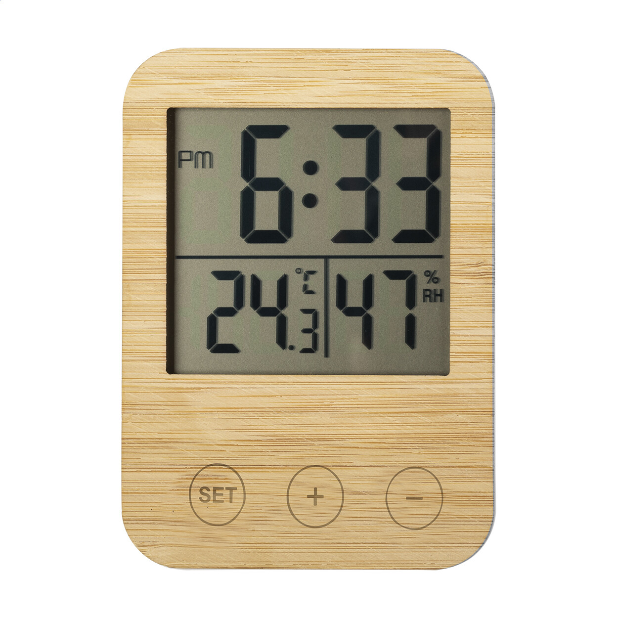 Station météo et horloge numérique en bambou avec affichage de la température et de l'hygrométrie. Fonctionne avec 2 piles AAA, sans piles.
