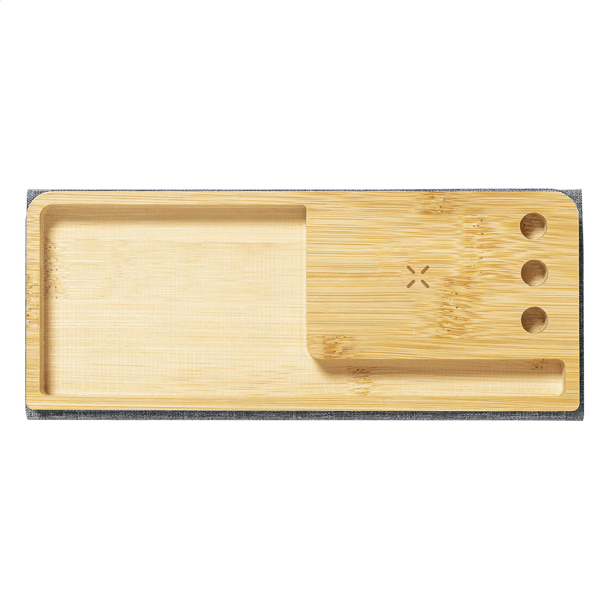 Tapis de souris pliable en polyester RPET avec base en silicone. Avec chargeur rapide sans fil intégré (15W) et support de téléphone portable en bambou. Polyester 300D RPET. Câble de chargement USB inclus.