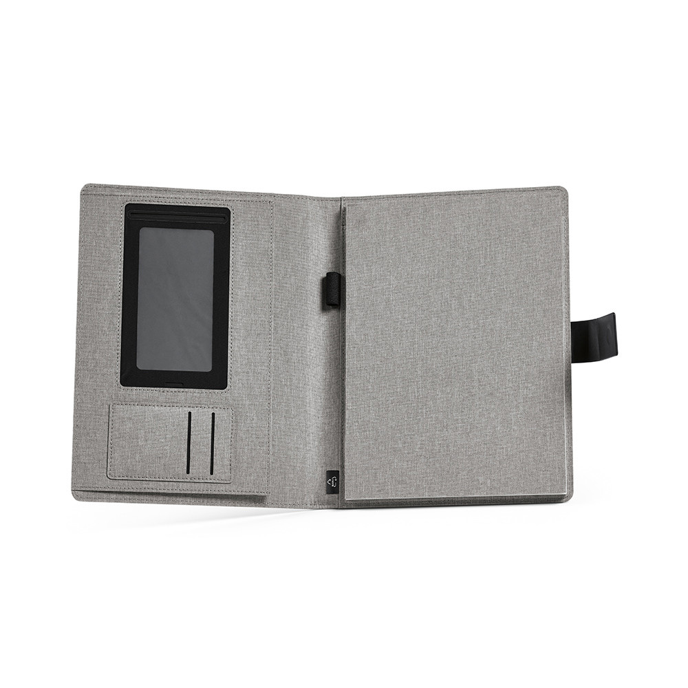 Conférencier Tolstoy A4 en rPET 300D avec fermeture magnétique en PU recyclé. Elle peut accueillir une tablette jusqu’à 29 x 18 cm, fournit avec un bloc-notes de 64 feuilles en papier issu de forêts durablement gérées courleur ivoire (70 g/m²) à pages pointillées, avec espaces dédiés à la date et à la numérotation. Elle comprend aussi un compartiment pour téléphone (jusqu’à 10 x 18 cm), deux emplacements pour cartes et un porte-stylo. Livrée dans une boîte individuelle en kraft recyclé. Cette pochette allie design, praticité et un choix engagé.
