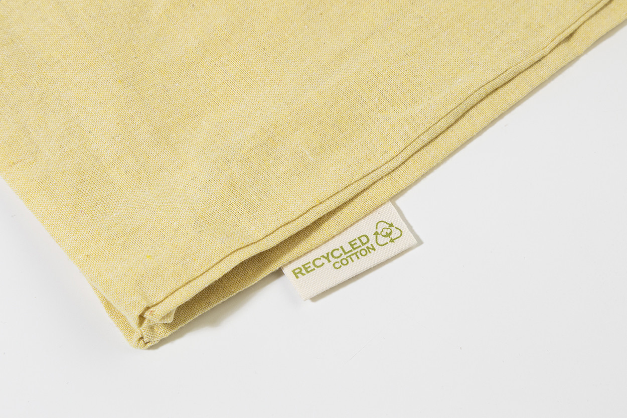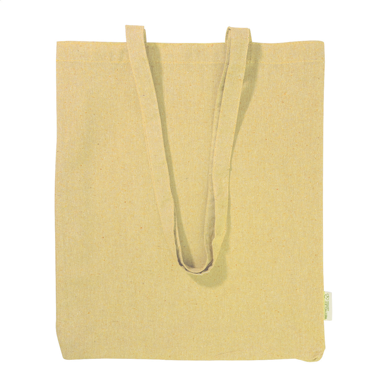 Tote bag réutilisable en coton recyclé avec de longues poignées et une étiquette distinctive coton recyclé. 100% coton recyclé, 140 g/m².
