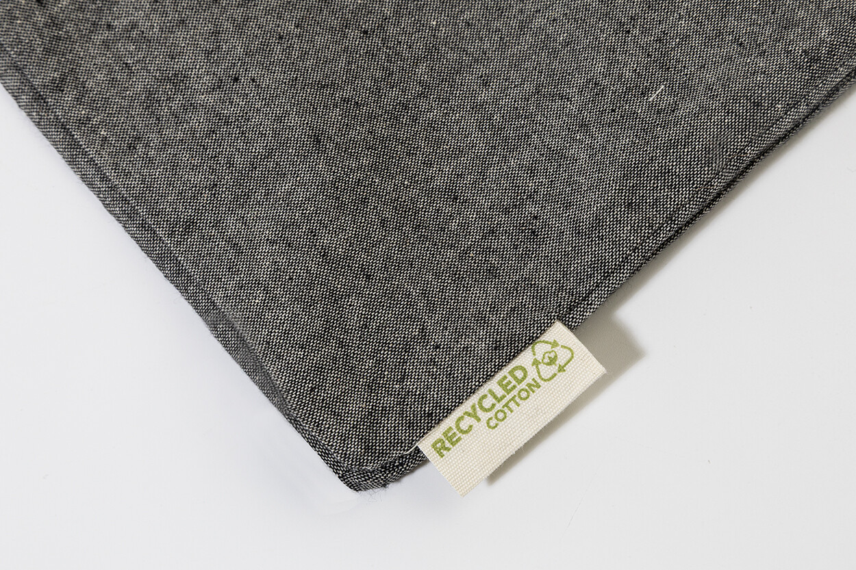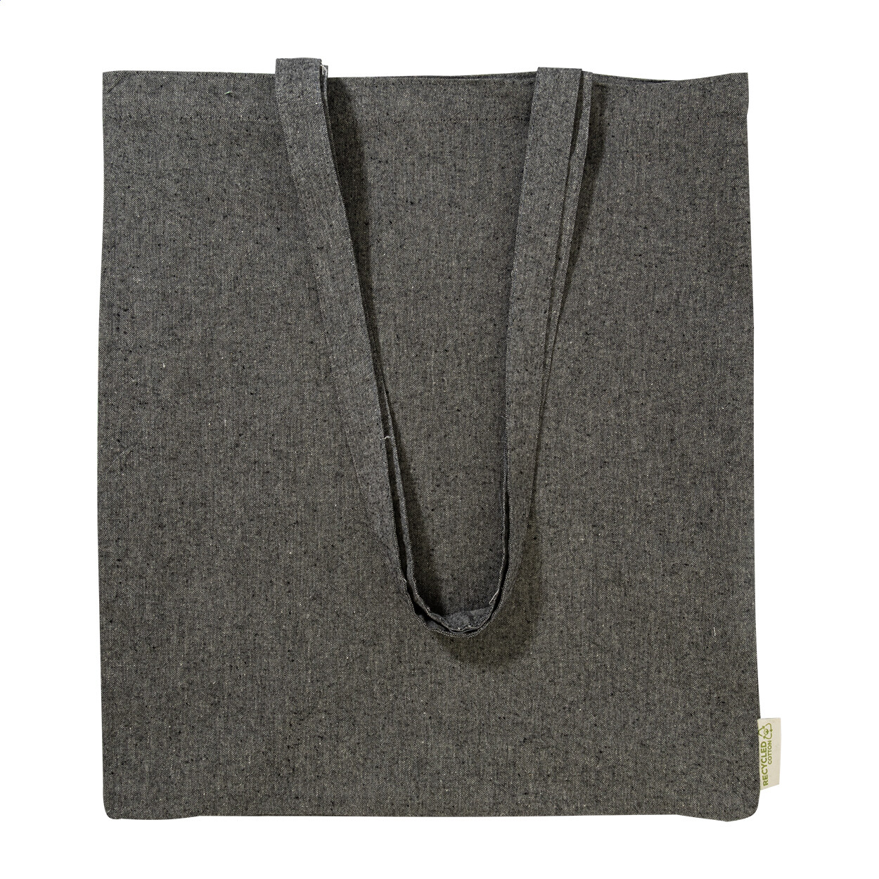 Tote bag réutilisable en coton recyclé avec de longues poignées et une étiquette distinctive coton recyclé. 100% coton recyclé, 140 g/m².