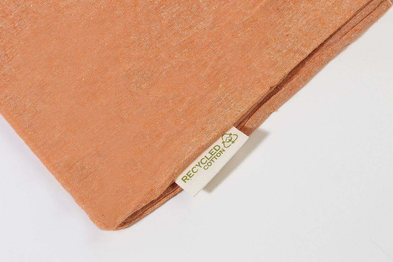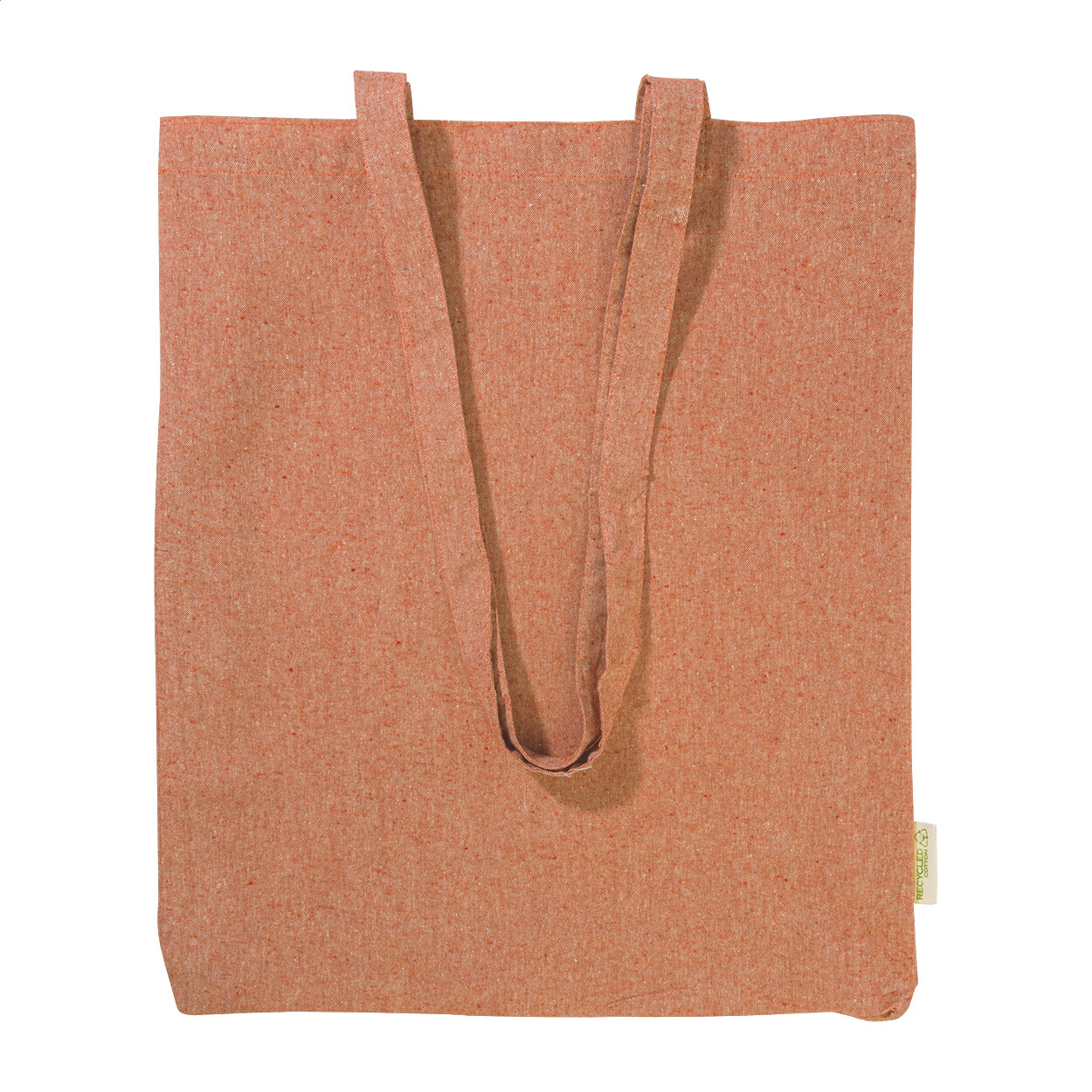 Tote bag réutilisable en coton recyclé avec de longues poignées et une étiquette distinctive coton recyclé. 100% coton recyclé, 140 g/m².