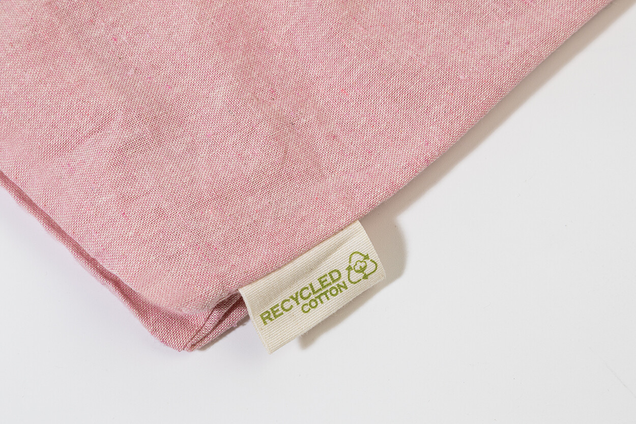 Tote bag réutilisable en coton recyclé avec de longues poignées et une étiquette distinctive coton recyclé. 100% coton recyclé, 140 g/m².