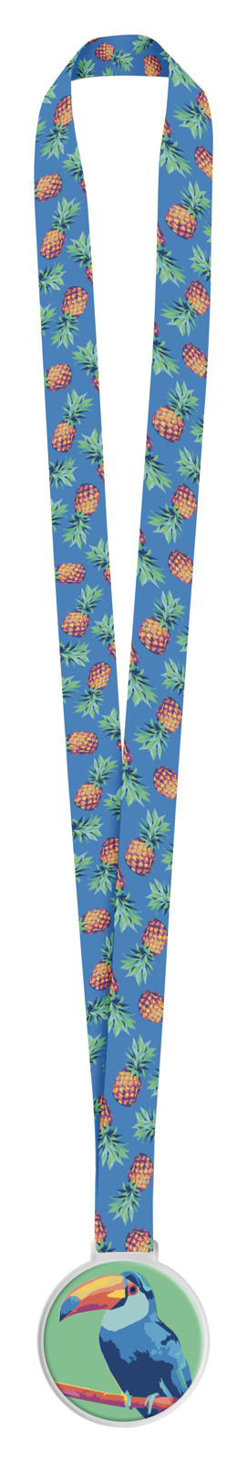 Tour de cou en polyester pour marquage en sublimation avec médaille acrylique pour marquage en doming. Le prix inclut le doming et la sublimation. Quantité minimale : 100 pcs.
