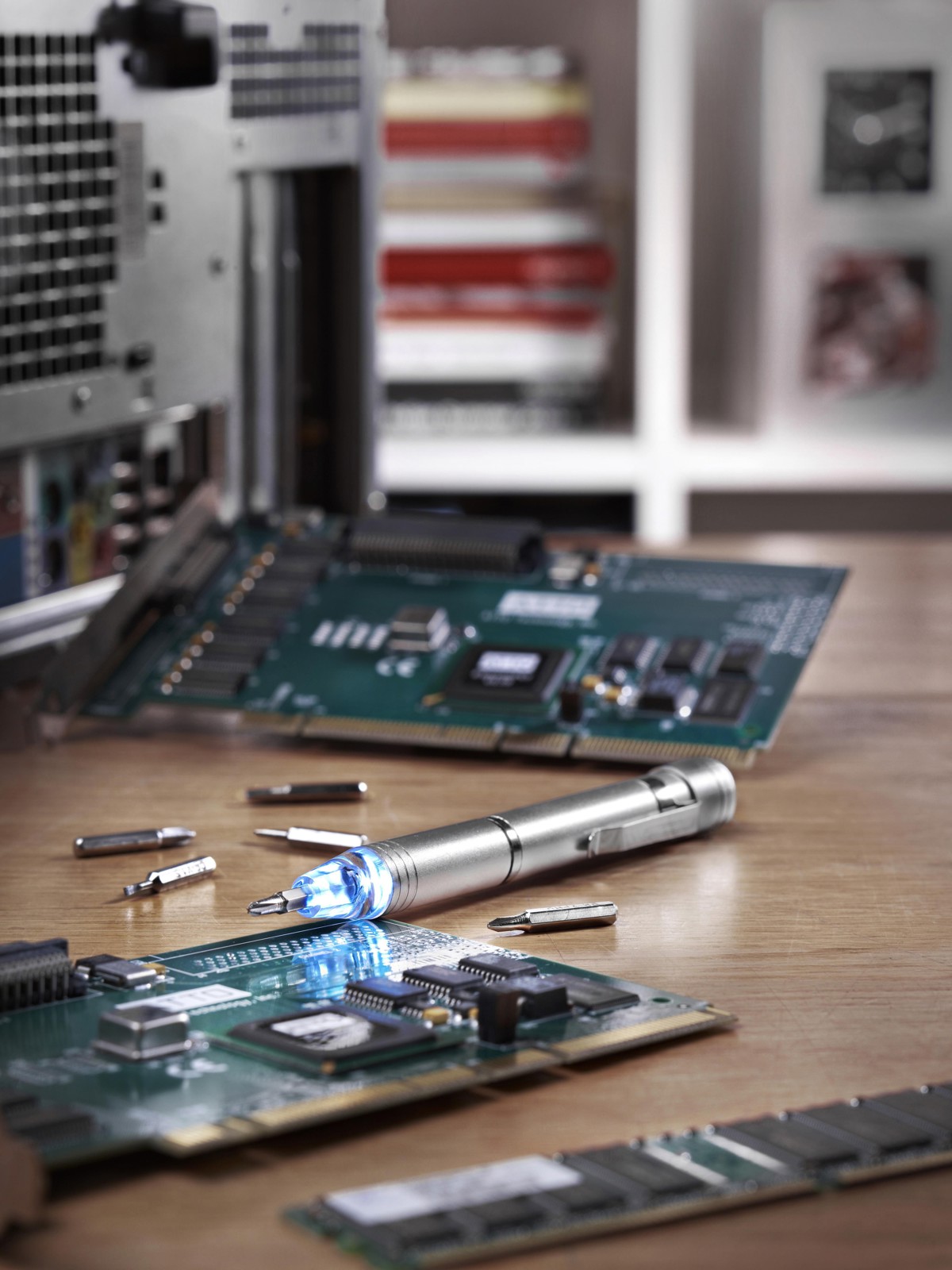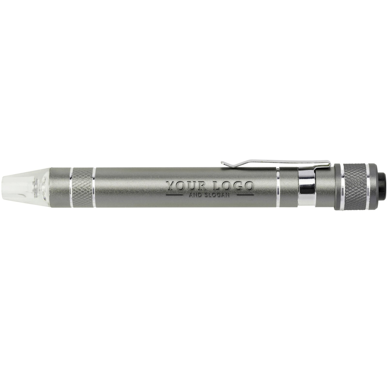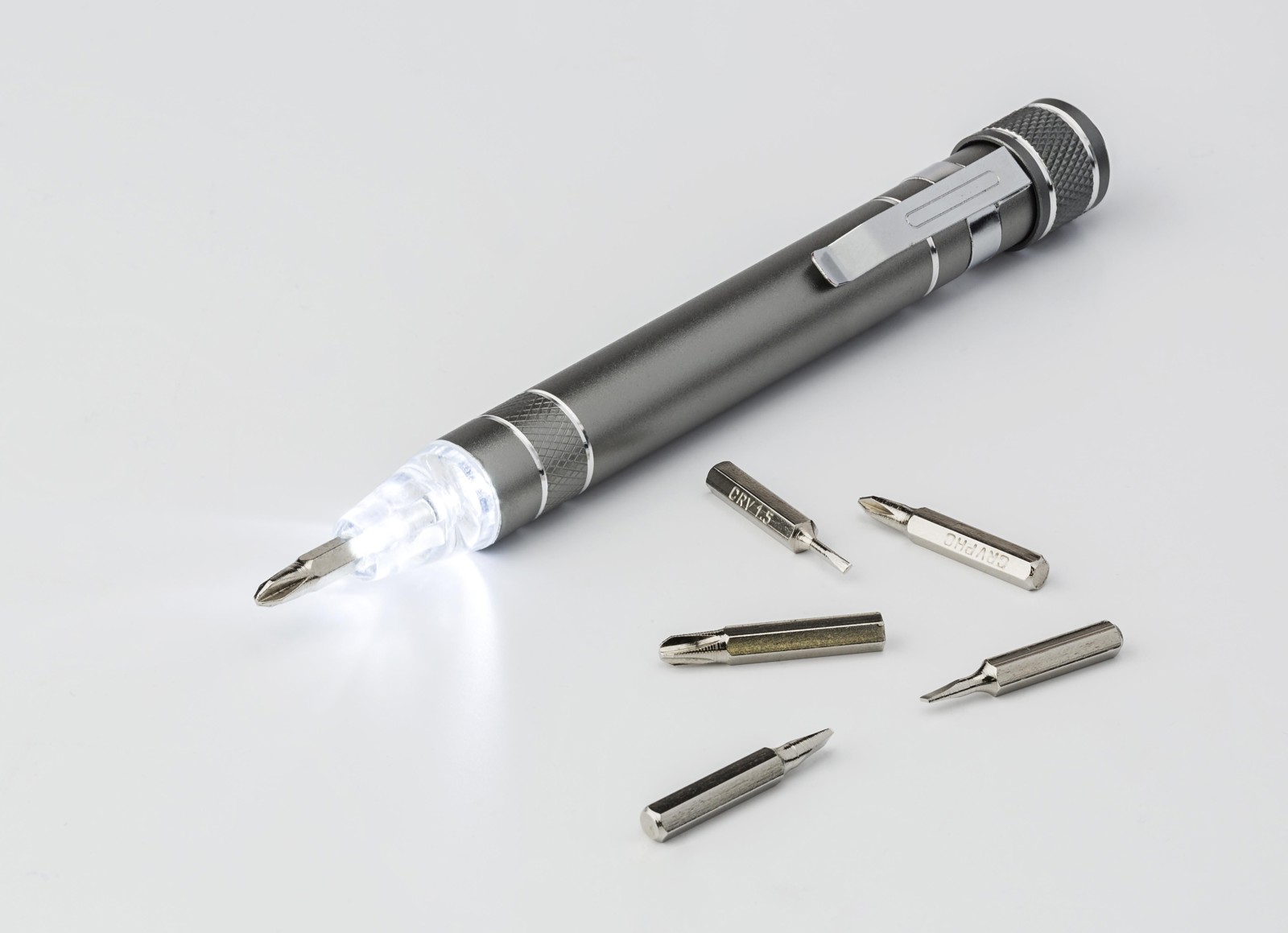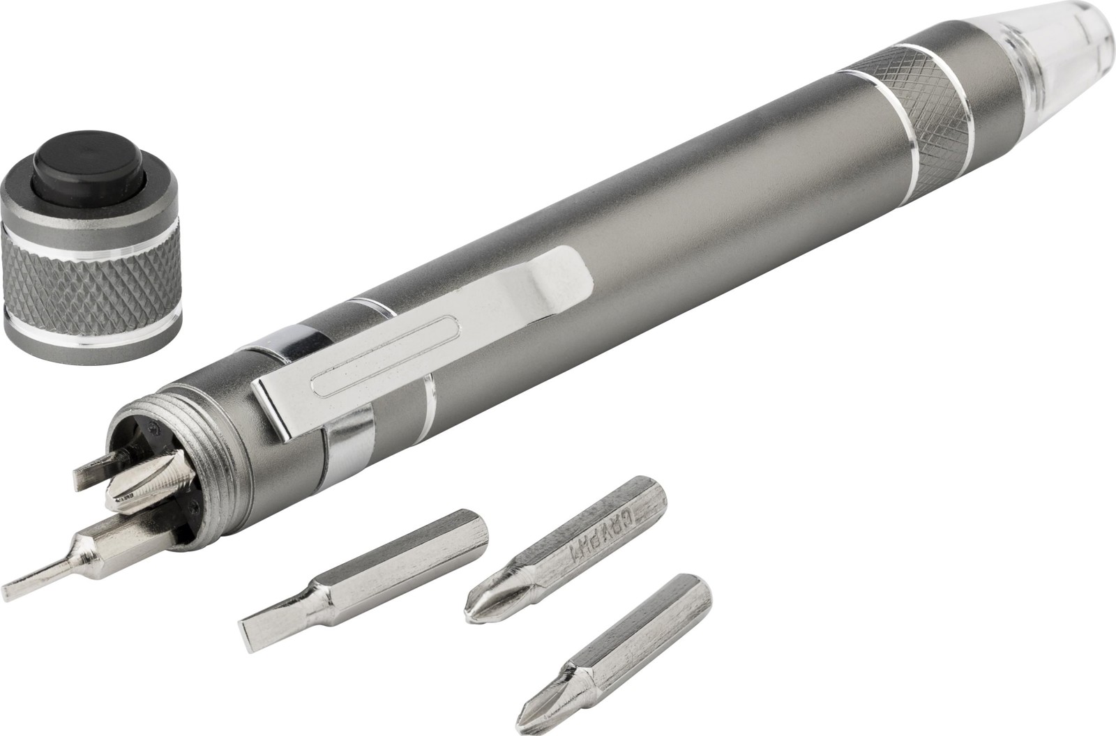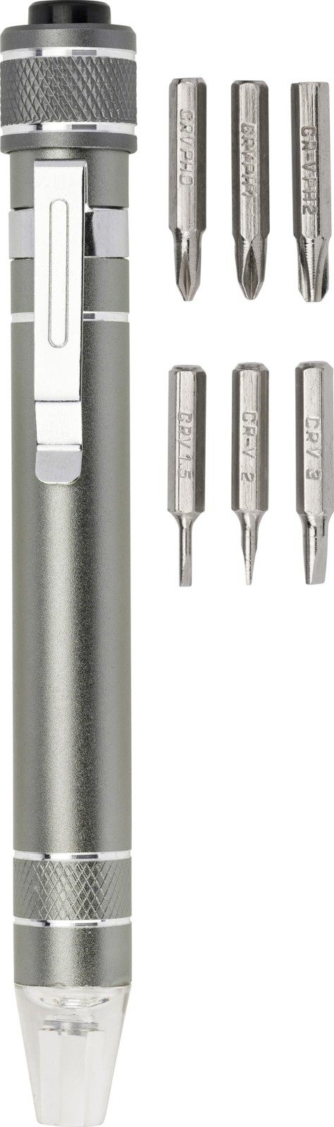 Tournevis en aluminium d'aspect métallique. Avec clip solide et 8 embouts: CRV1.5 - CRV2.0 - CRV3.0 - CRV3.5 - PH000 - PH0 - PH1 - PH2. Emballage par pièce.