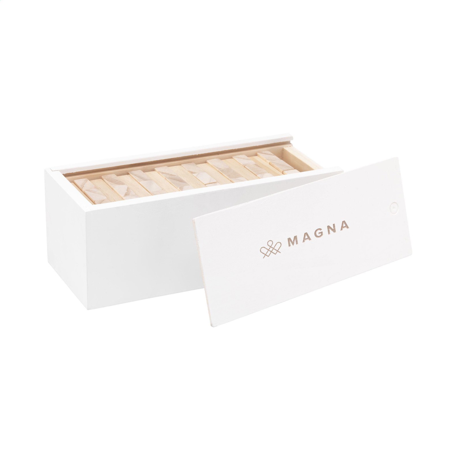 Jeu d'empilement en bois (54 blocs). Dimensions de la tour : 17,8 x 5 x 5 cm. Chaque ensemble est emballé dans un sac en coton. Règles du jeu incluses.