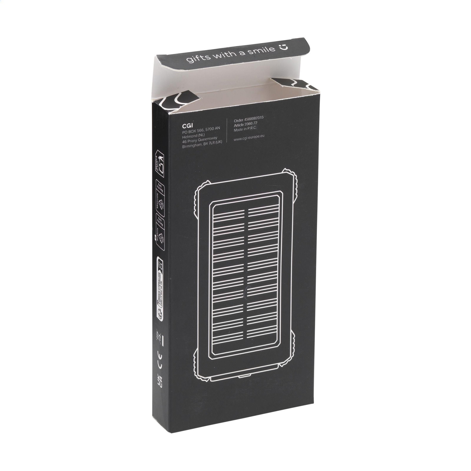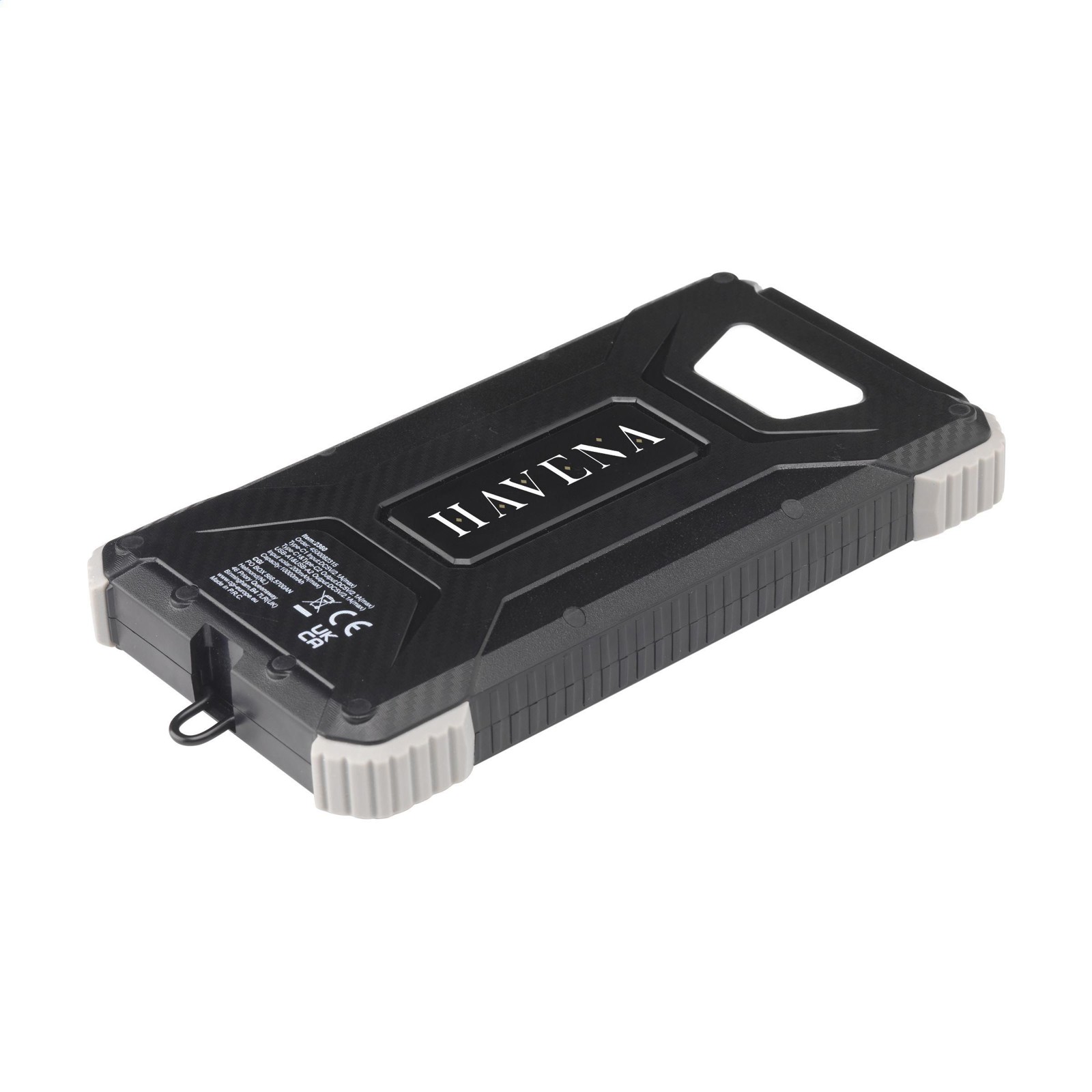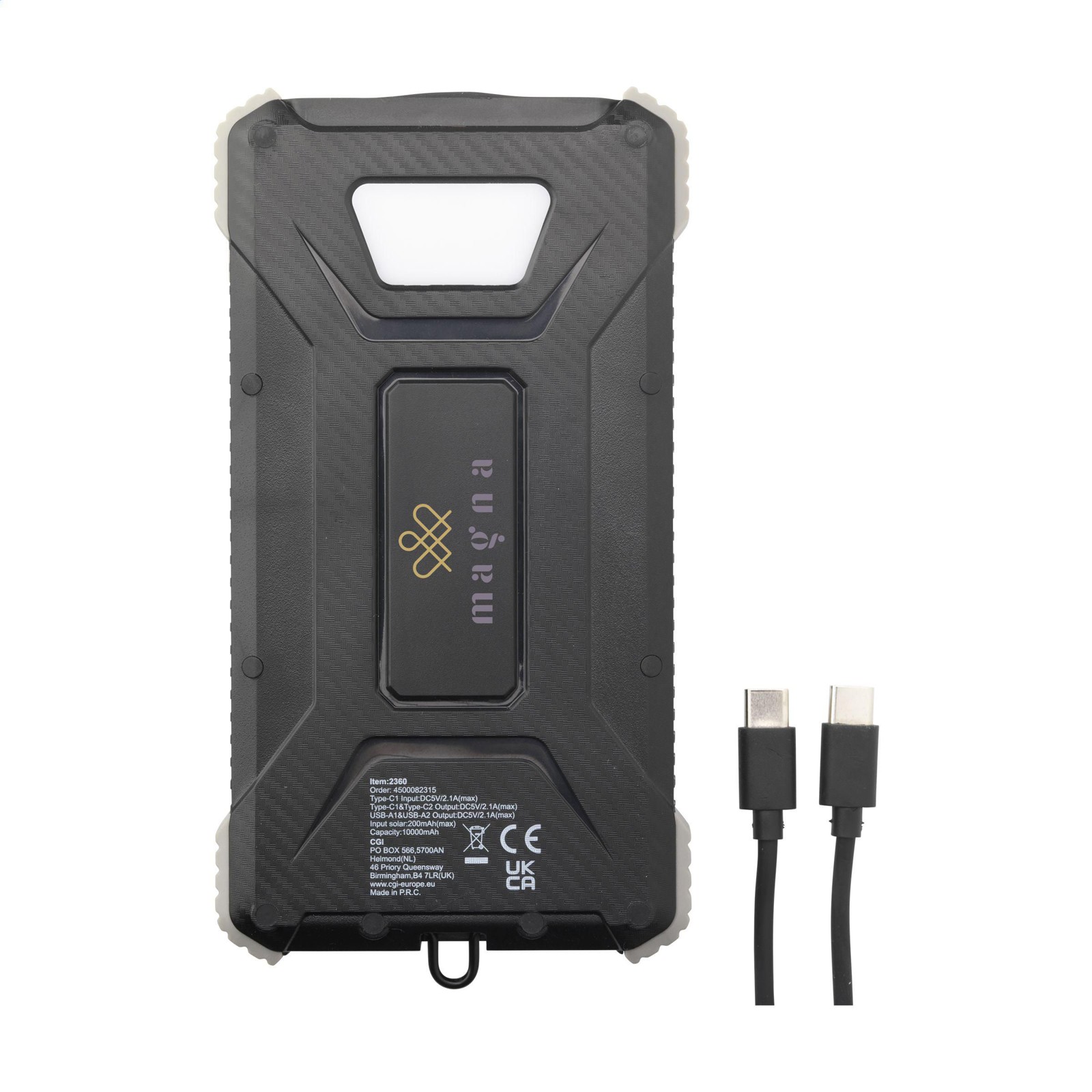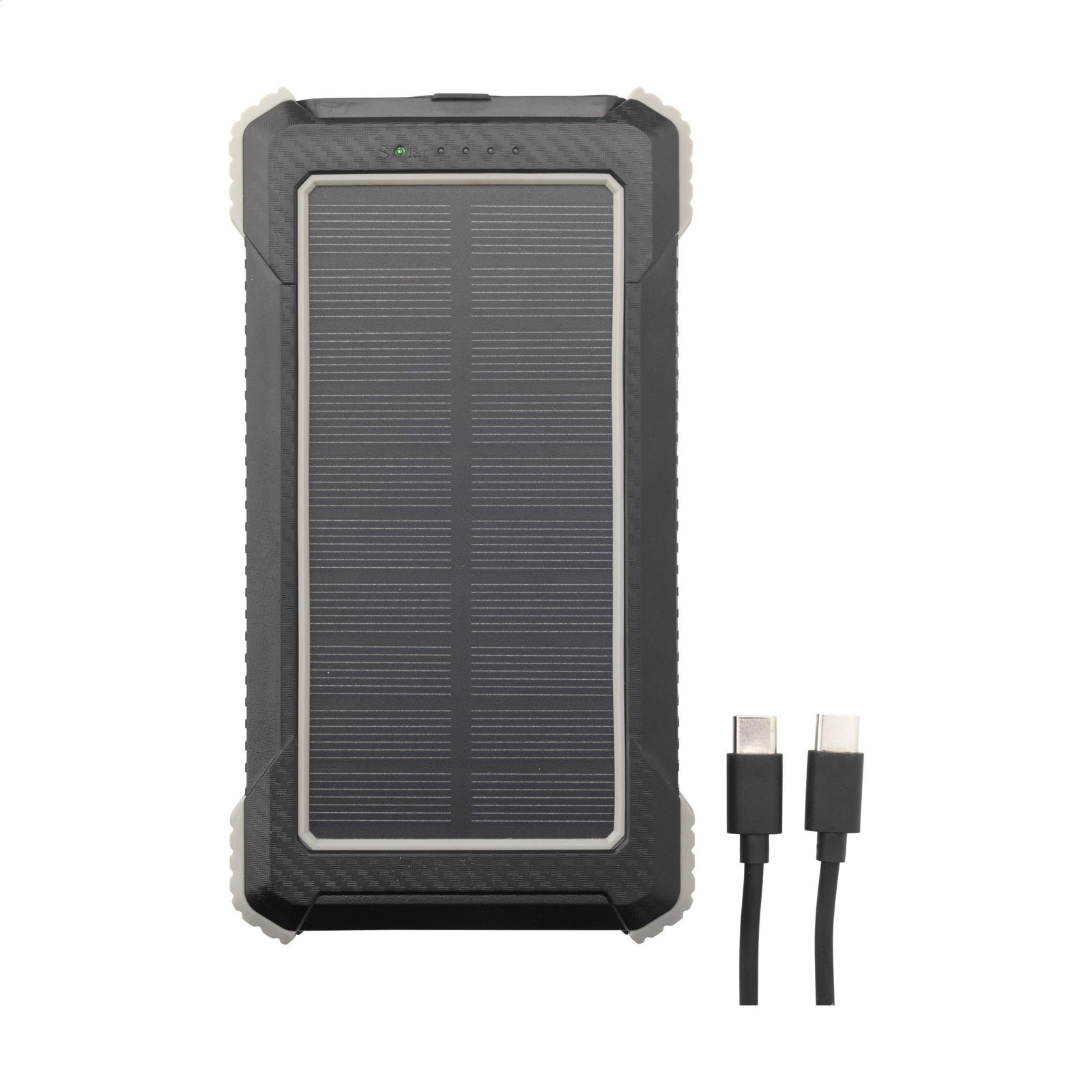 Powerbank solaire robuste pour activités extérieur, d'une capacité de 10 000 mAh, avec un boîtier en ABS recyclé et des bords protecteurs en silicone sur les coins. Équipé d'un panneau solaire, de voyants lumineux, d'une torche LED et d'un anneau de suspension pliable. Résistant aux éclaboussures de l'eau et à la poussière.Convient pour recharger la plupart des smartphones et autres appareils. Entrée : Type-C1 DC5V/2.1A. Sortie : DC 5V 2A. 2 x port USB-A et 2 x port USB-C. Entrée solaire : 100 MAh. Temps de charge solaire d'environ 50 heures. Le chargeur idéal pour les activités de plein air. Câble de charge USB-C/USB-C et mode d'emploi inclus. Certifié RCS. Matière recyclée totale : 20%.