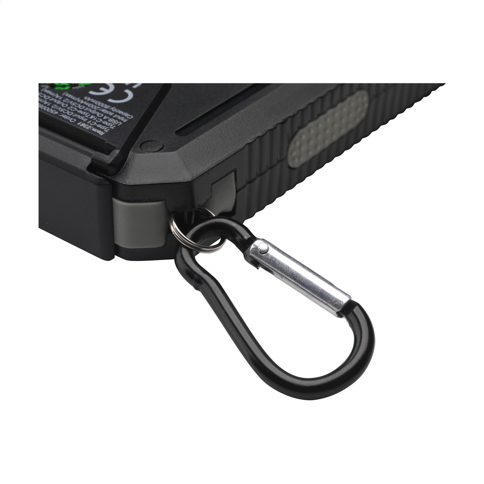 Powerbank solaire robuste pour activités extérieur, d'une capacité de 8 000 mAh, avec un boîtier en ABS recyclé et des bords protecteurs en silicone sur les coins. Comprend un panneau solaire, une boussole intégrée, des voyants lumineux, une torche LED et un mousqueton. Résistant aux éclaboussures de l'eau et à la poussière. Convient pour recharger la plupart des smartphones et autres appareils courants. Entrée : Type-C DC5V/2.1A. Sortie : Type-C DC5V/2.1A. 1 x port USB-A et 2 x port USB-C. Entrée solaire : 200 mAh. Temps de charge solaire d'environ 40 heures. Peut être rechargé sur secteur ou via un panneau solaire. Le chargeur idéal et polyvalent pour les activités de plein air. Câble de charge USB-C/USB-C et mode d'emploi inclus. Certifié RCS. Matière recyclée totale : 17%.