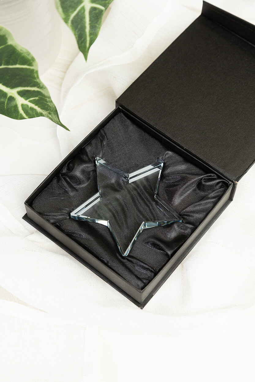 Trophée en verre en forme d'étoile, présenté dans un coffret cadeau noir.