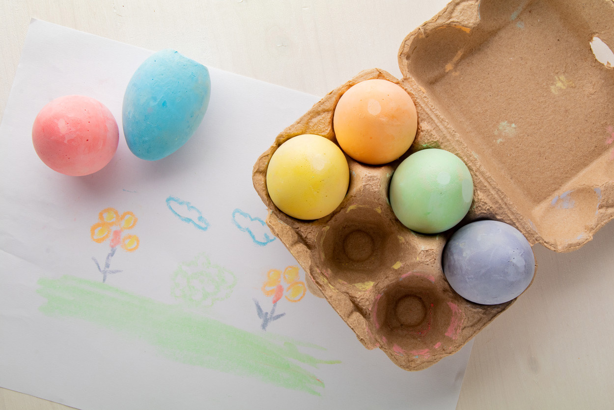 Lot de 6 œufs craie de couleur dans une boîte à œufs en carton.