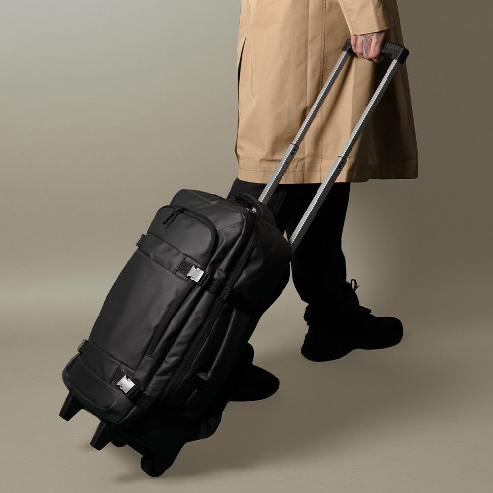 Valise à quatre roues pivotantes à deux positions avec fonction sac à dos fabriqué en PU 600D Résistant à l'eau. Il a une poignée latérale, un compartiment pour ordinateur portable et des fermetures éclair latérales pour modifier sa taille.